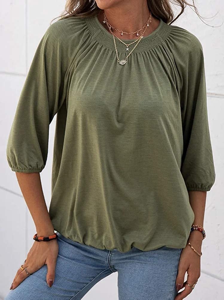 Grlasen Women's Solid Crew Neck T Shirt Blouse Cotton Half Sleeve 3/4 Sleeve Casual Loose Pleated Basic Tops