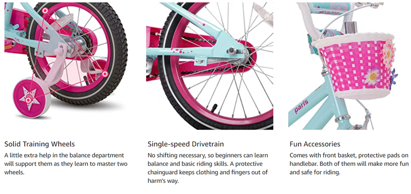 • 4, Single-speed drivetrain and soft grips keep it easy for her to learn and feel comfortable behind the wheel. The bicycles come with basket and DIY Decal stickers adding more fun for your child to get pedaling up to speed in a flash. Non-slip resin pedal with reflectors and one piece crank contribute to the minimum maintenance.