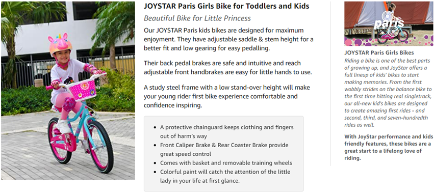 • 1, JOYSTAR Paris Girls bike with 14-inch wheels is designed for toddler 3-5 years old or 35 - 47 inches tall. This bicycle has adjustable saddle & stem height for a better fit and low gearing for easy pedalling. The Paris is perfect for riding to the park or riding on the sidewalk around the neighborhood.