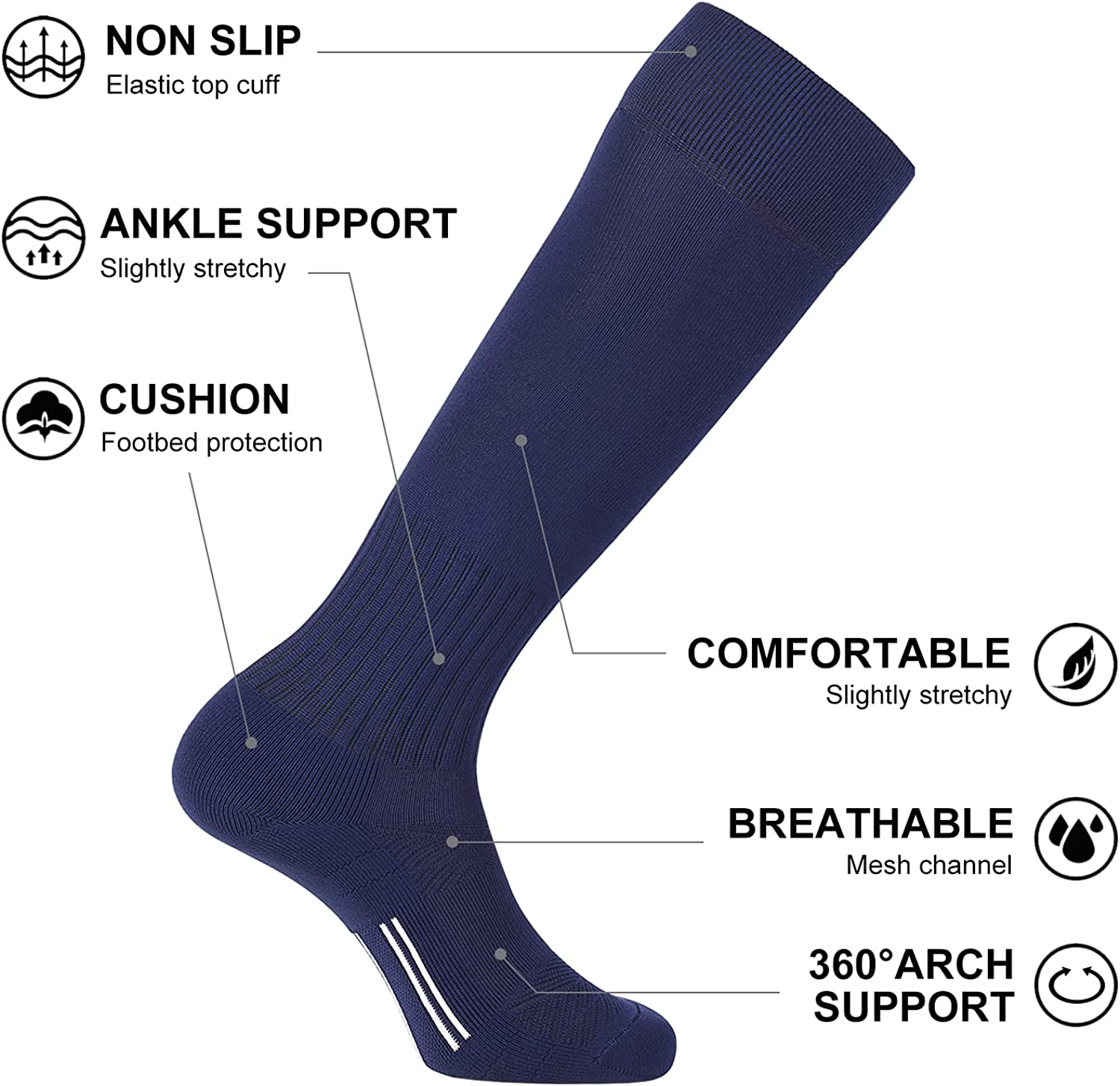 COMFORTABLE & SOFT : These football socks are made of nylon with spandex for bringing softness to your feet. The men's and youth soccer socks have added extra cushion on the toe and sole for shock absorption, reducing friction by vastly reducing the amount of rubbing and slipping your feet experience during exercise.