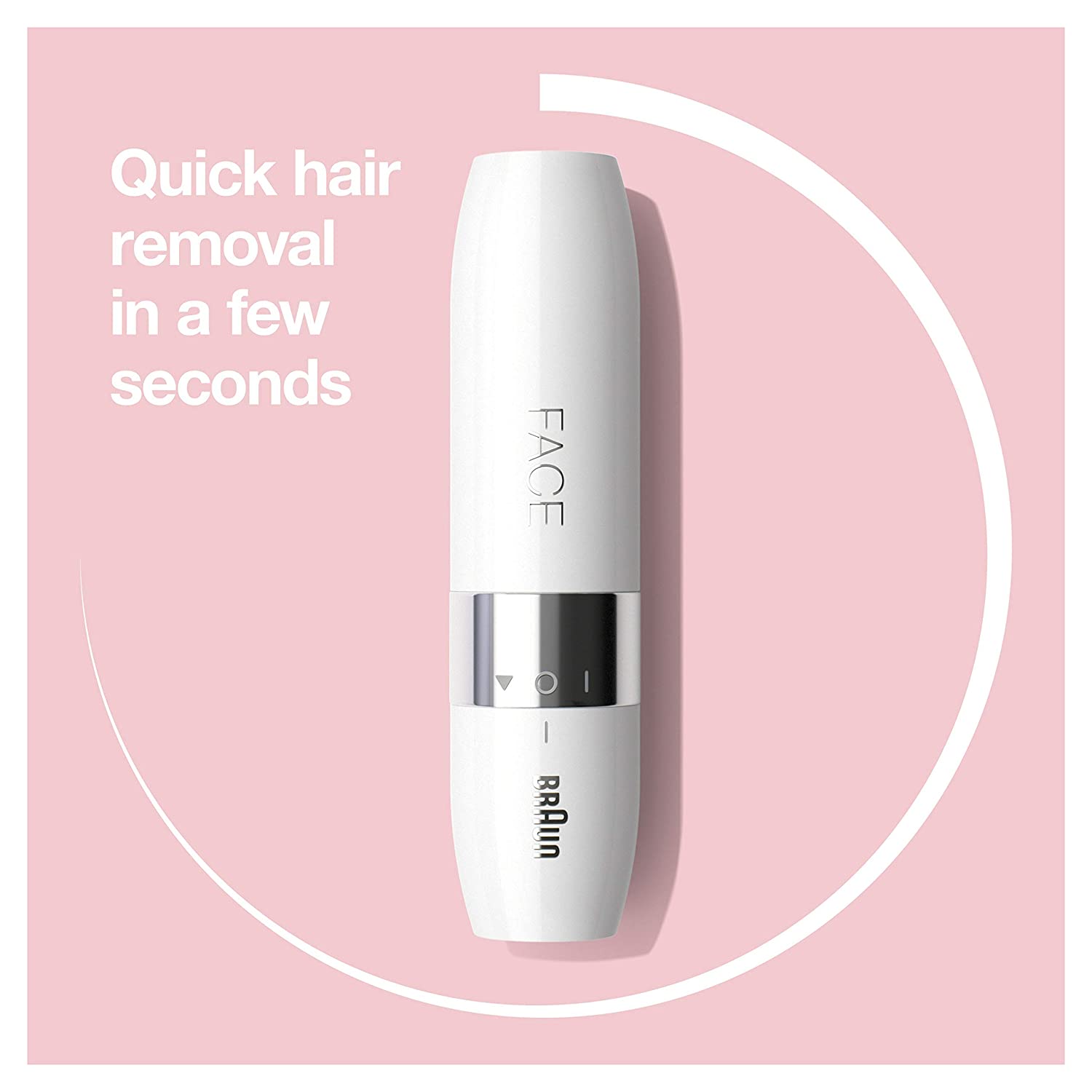 An elegantly designed, mini-sized electric facial hair remover for women, delivering fast and gentle hair removal results. The Braun Mini Hair Remover cuts hair close to skin level, leaving your face smooth, consistent and free of peach fuzz. Quick and gentle hair removal: whenever, wherever.Box includes: 1 X Mini Hair Remover1 X White Cap1 X Cleaning Brush1 X AA Battery