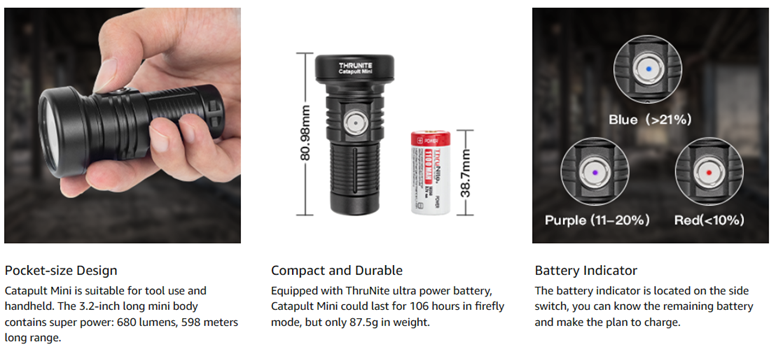 Catapult Mini uses a rechargeable lithium battery and utilizes an improved OSRAM KW.CSLNM1.TG LED, producing a maximum of 680 lumens for up to 653 yards/598 meters of throw.