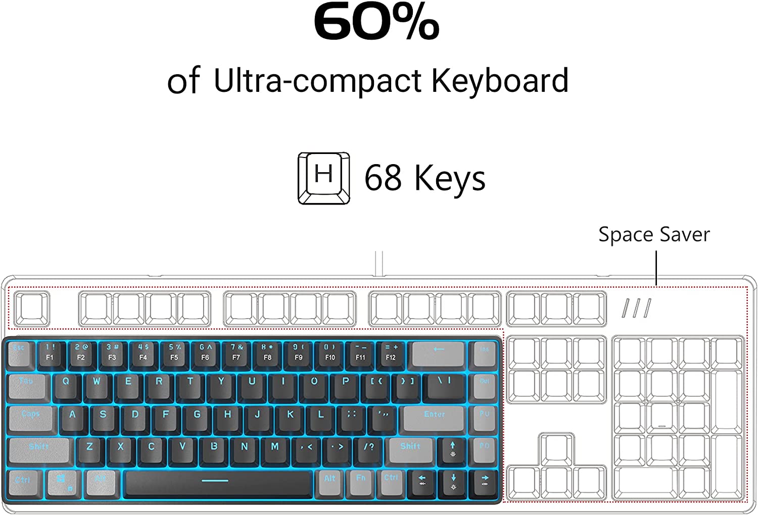 • Mini portable 60% compact layout: MK-Box is a 68 keys mechanical keyboard have cute small size, separate arrow keys and all your F-keys you need, can use it for gaming or work while saving space.