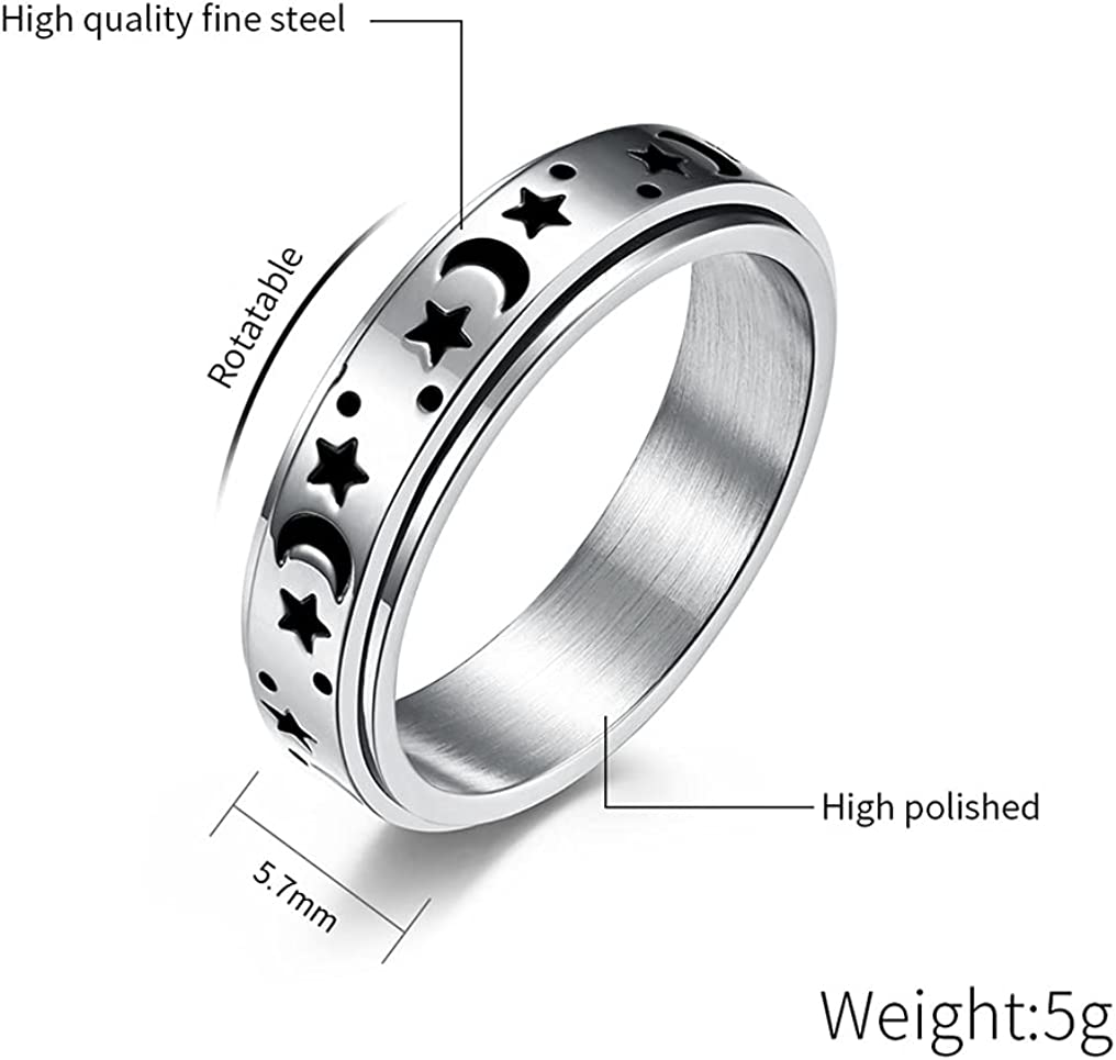 [DESIGNS] Sold by 21 Holiday! Punk fashion moon star rotatable band rings for men, boys, women and teenage gils. Made of quality stainless steel, hypoallergenic, lead & nickel free, comfortable to wear, easy to put on and take off. High polished finish makes these rings become bright.