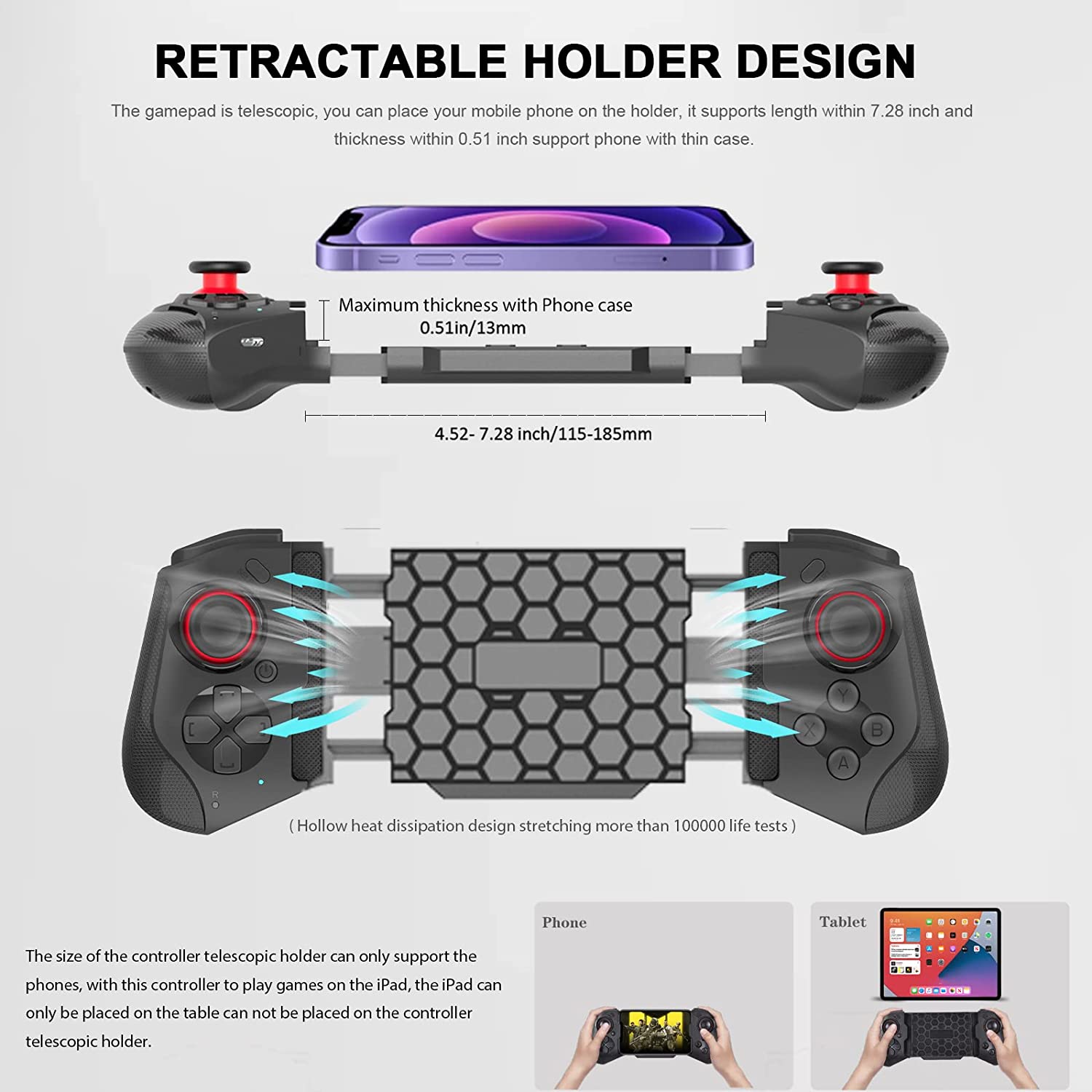 【Works for iOS 14.0+】Mobile gaming controller for any iPhones. For iPhone 14, 14 Plus, 14 Pro, 14 Pro Max, iPhone 13, iPhone 13 mini, iPhone 13 Pro, iPhone 13 Pro Max, iPhone 12, 12 Pro, 12 Pro Max, X, XR, XS, XS Max, 11 Pro, 11 Pro Max, 11, 7Plus, 8Plus and more. The gaming gamepad also works for iPad, iPad Pro and iPad Air, but the controller telescoping stand can be stretched to be compatible with up to 7.2-inch iPhones, so iPads over 7.2 inches cannot be placed on the controller stand.