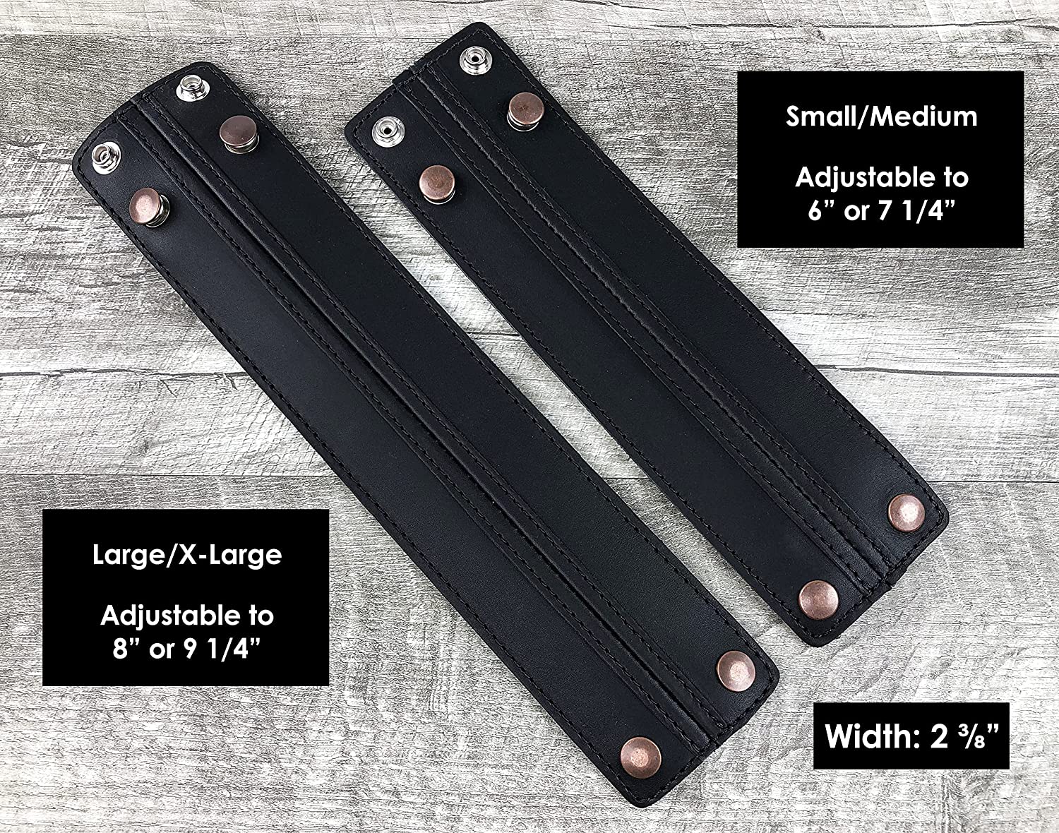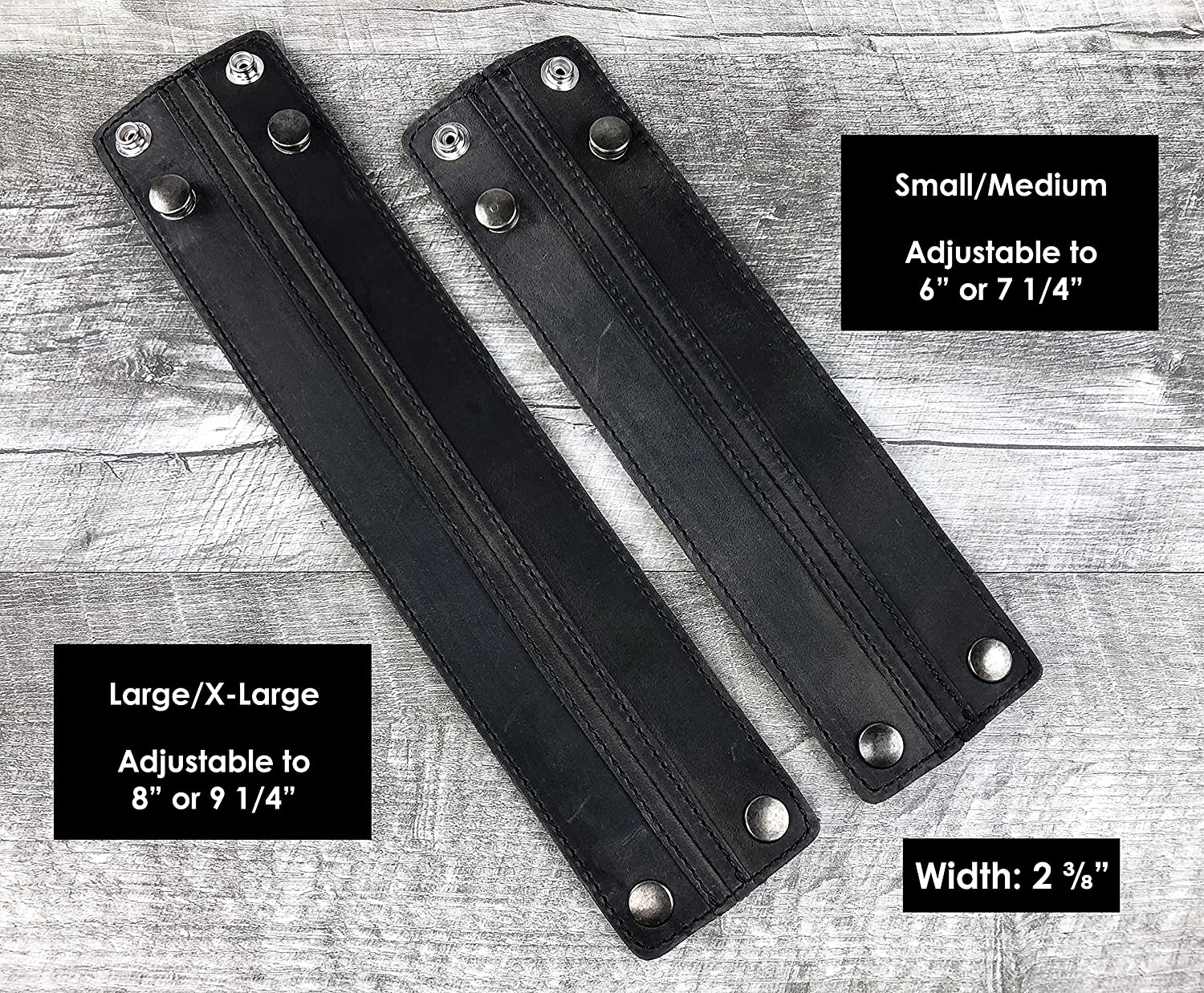 SIZE & COMFORT: This small/medium sized leather cuff bracelet adjusts to either 6” or 7 ¼” (measure your wrist size where you would wear the cuff before ordering. Most people will fit into the small/medium size). Width: 2 3/8". We go the extra distance including extra snap covers so you can have your exposed snaps covered when using the larger size setting. We also over-designed comfort with full grain pigskin leather for the inside of the cuff which is smooth and comfortable. No sticky suede!