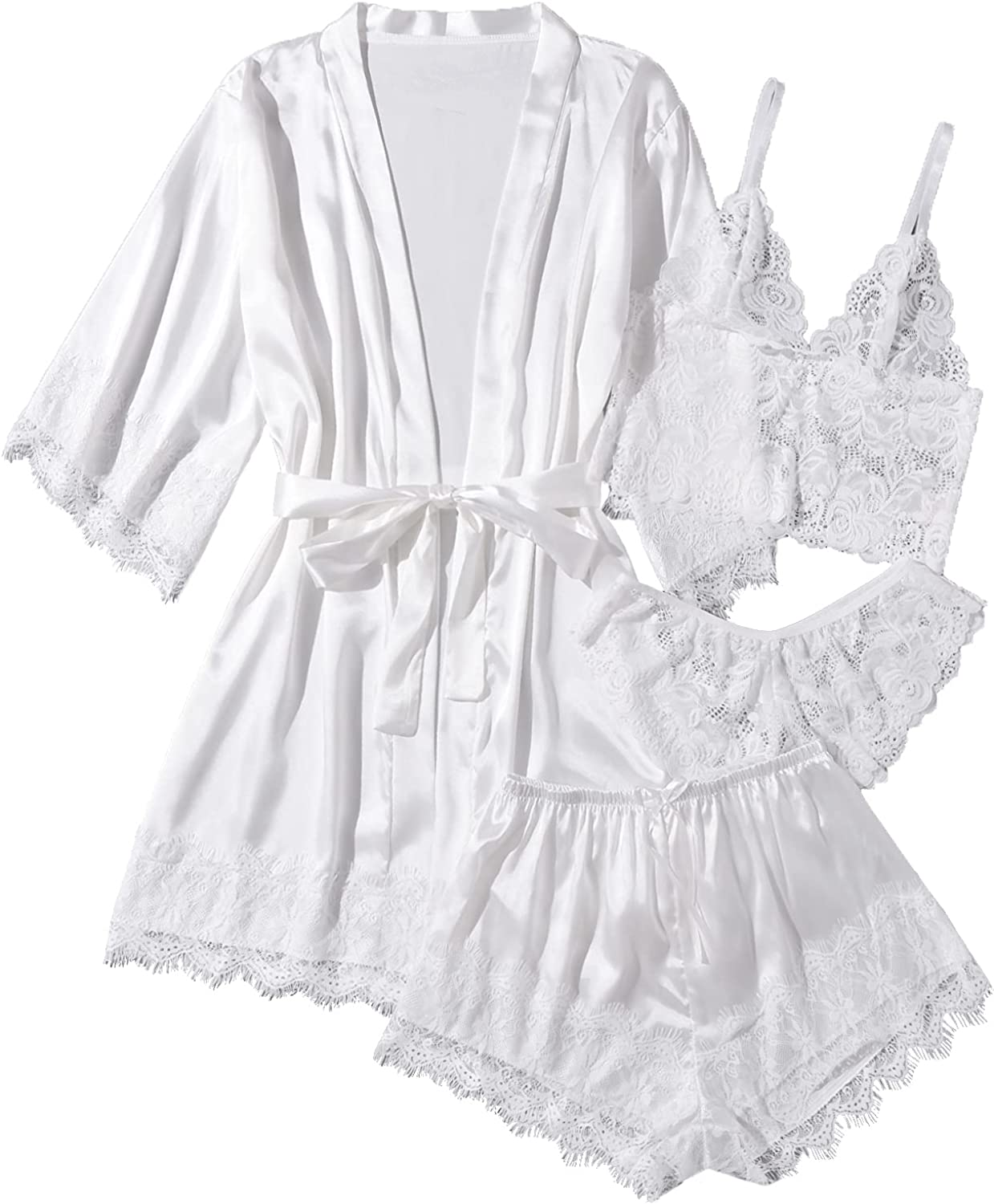SOLY HUX Women's Satin Pajama Set 4pcs Floral Lace Trim Cami Lingerie Sleepwear with Robe