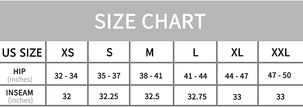 ELASTIC & ANTISKID WAISTBAND: The soft and elastic waistband with belt loops for the perfect fit. The premium antiskid strips on waistband keep your pants from running up and down. ACCURATE SIZING: X-Small - Hip 32-34" Inseam 32", Small - Hip 35-37" Inseam 32.25", Medium - Hip 38-41" Inseam 32.5", Large - Hip 41-44" Inseam 32.75", X-Large - Hip 44-47" Inseam 33", XX-Large - Hip 47-50" Inseam 33".
