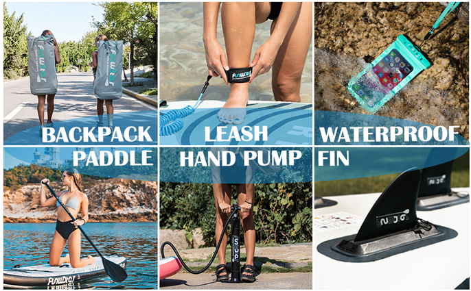 - 【Package Including】1×inflatable paddle board, 1×adjustable sup paddle ,3×fins , 1×sup pump , 1×backpack , 1×waterproof phone bag, 1×leash .