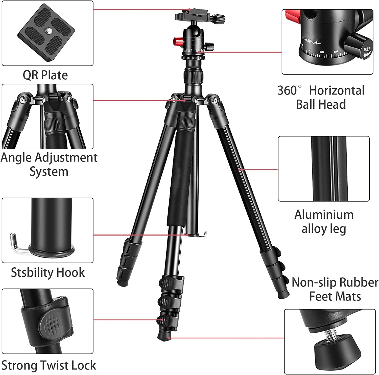 ZIKZOK Professional 62" DSLR Tripod Camera Tripods with Phone Holder for Travel, Super Lightweight and Reliable Stability, Ball Head Tripod Detachable Monopod with Carry Bag (Black)