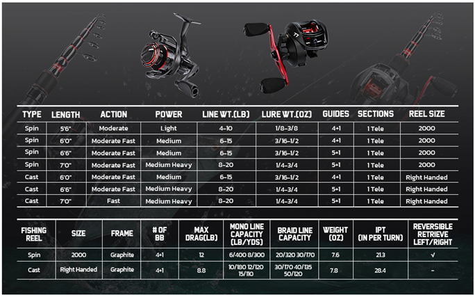 To match the great telescopic fishing rods, Calamus picks the high quality size 2000 spinning reels and casting reels to build the combo. With stainless-steel ball bearings (4+1 for spinning and 5+1 for casting), machined aluminum spool, the fishing combos are great to fish with and can offer performance and comfort all-day.