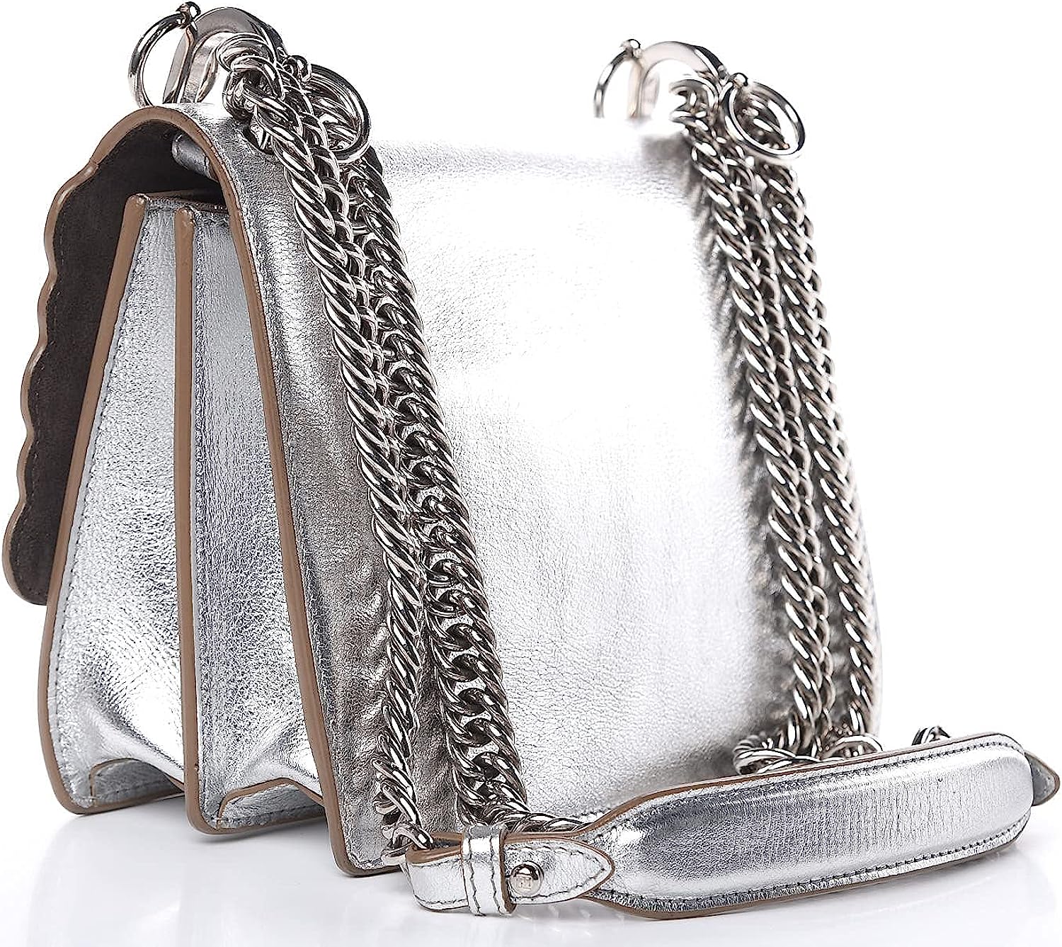This shoulder bag is crafted of smooth calfskin leather in metallic silver with scalloped edges. This shoulder bag features a long polished silver-tone chain link strap with a shoulder pad and silver rings on the anchor to hold bag charms. The front flap has a decorative pyramid stud closure. The front opens to a partitioned grey suede interior with a patch pocket. This handbag is perfect for day or evening use, from Fendi!