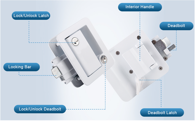 Included Components | 1 × RV Door Lock; 1 × Inside Latch; 1 × Outside Latch; 4 × Keys; 12 × Screws |