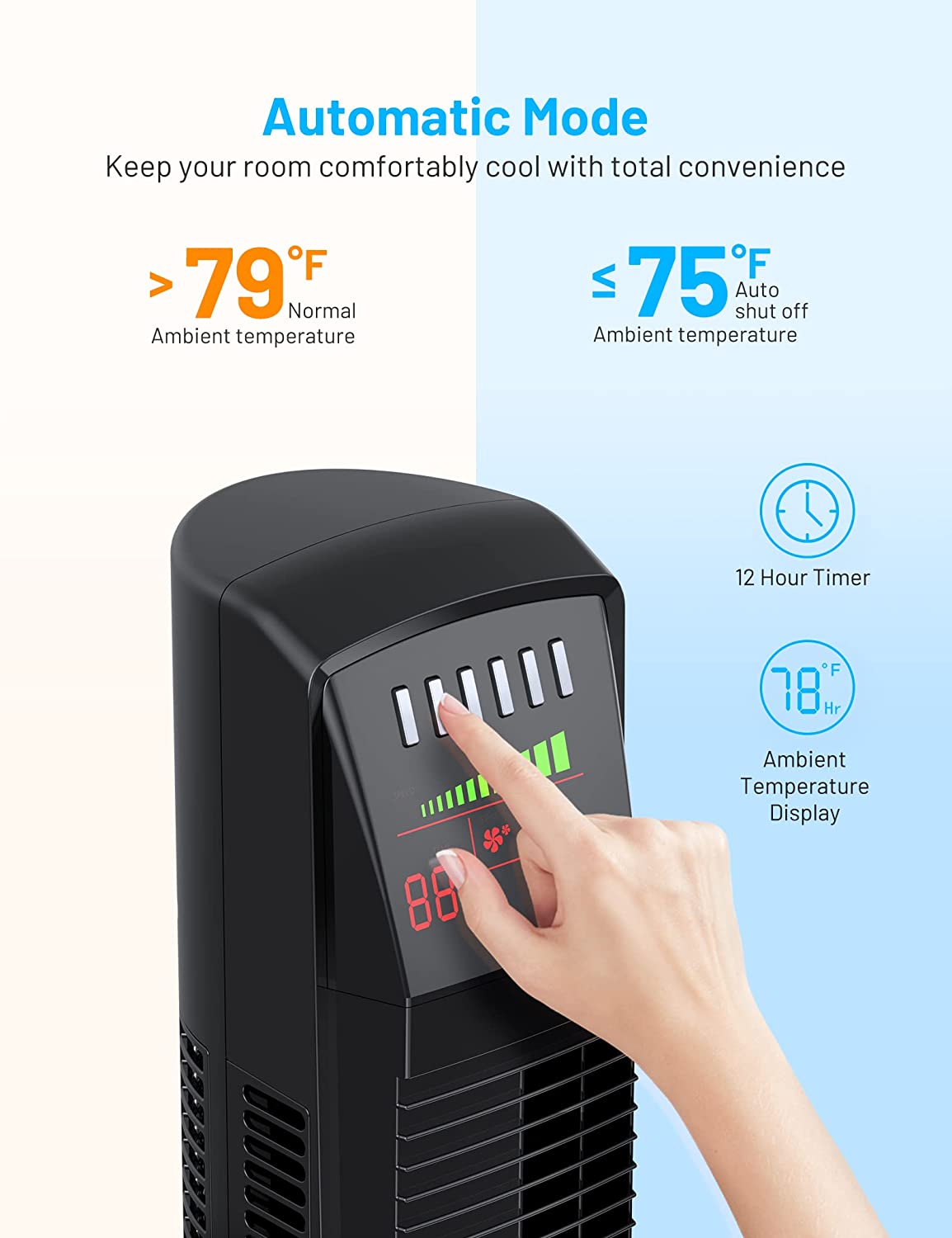 - How many times have you wished you could turn on or off your fan in the middle of the night without having to leave your bed? Now you can! Activate auto mode for the tower fan to run while the ambient temp is over 79°F and auto shuts off when less than 75°F, you’ll always inhabit a pleasant and healthy space.