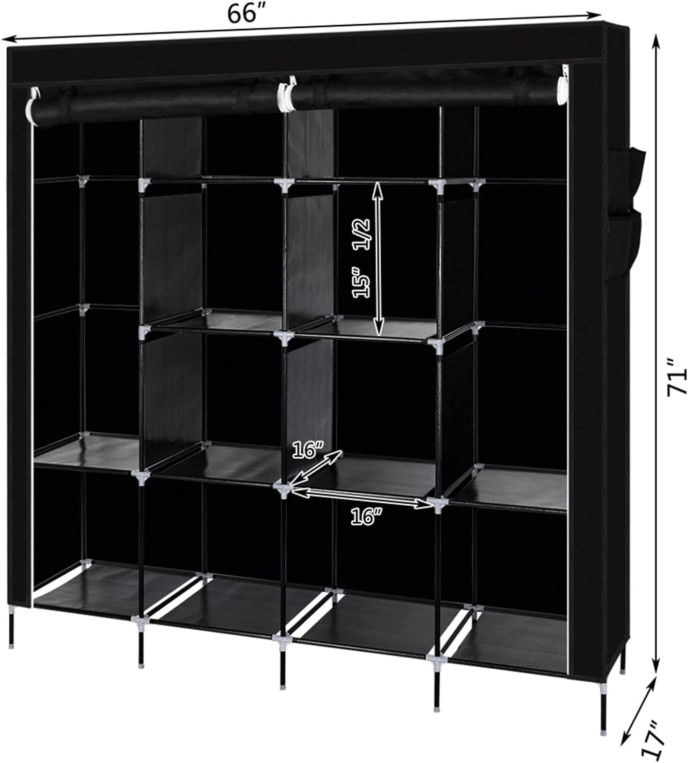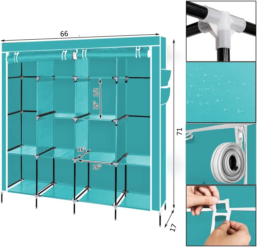 【SPACIOUS STORAGE SPACE】: The size of the portable closet wardrobe is 66x17x66/71 inches (with bottom bar), it comes with 1 removable clothes rail and 12 storage racks. Not only does this wardrobe provide extra space for your coats, dresses, sheets, folded clothes and more, it also meets your long-term storage needs.