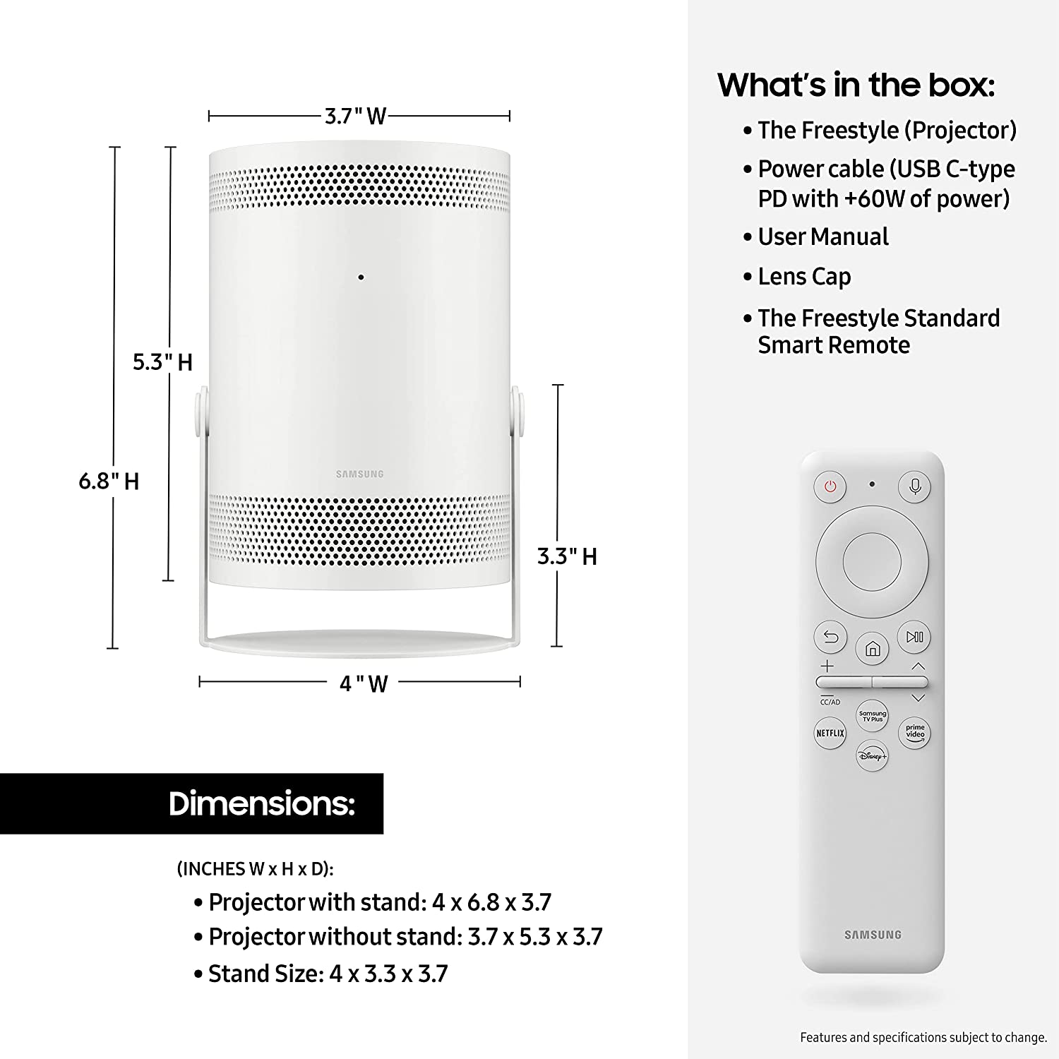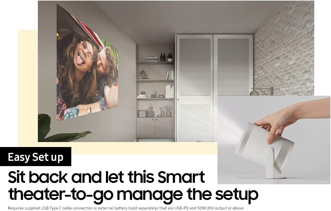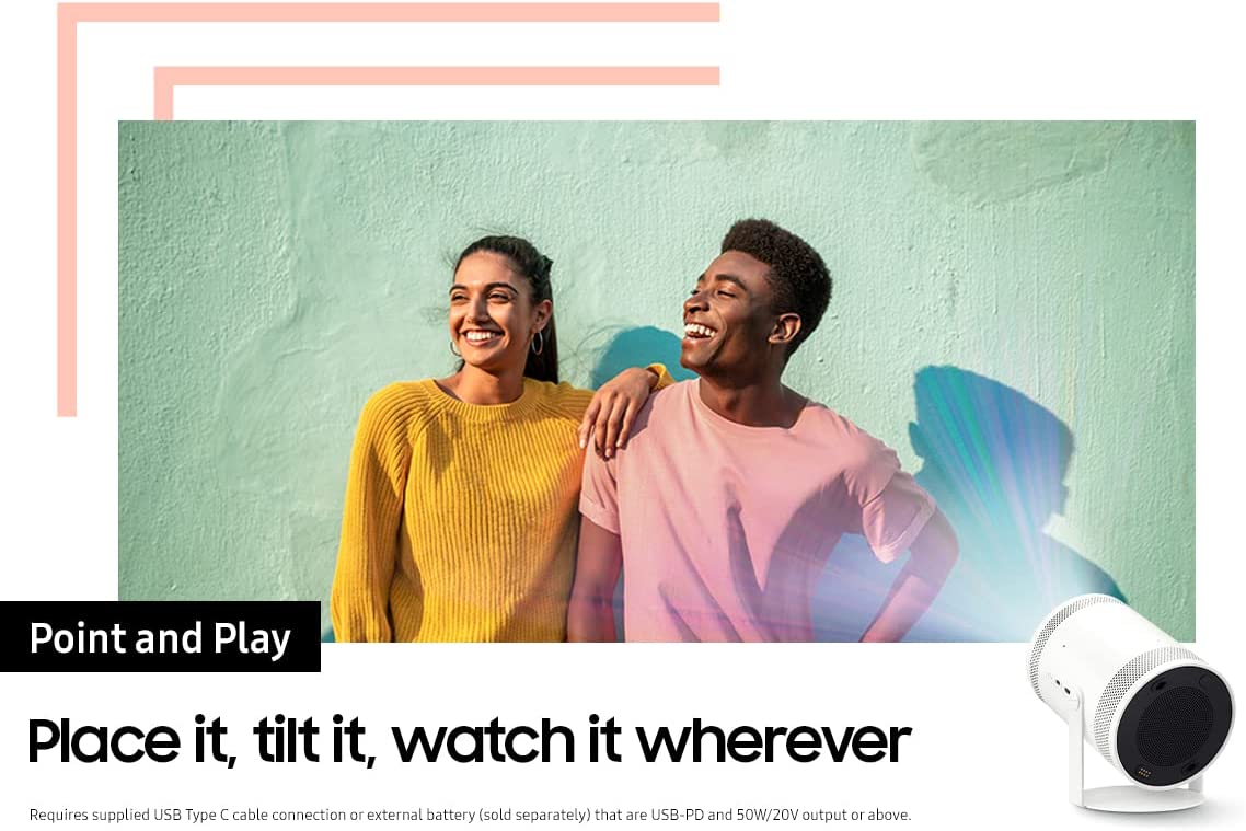 Take the big screen experience to go with The Freestyle. This smart theater-to-go moves to where the action is. Just point and play on the wall, ceiling or even your table. The Freestyle automatically sets up your best picture experience, adjusting focus, keystone and leveling—at the image size you want. You’ll be set to stream your shows using the Smart TV capabilities, check your social feed, play games, and hear it all in rich 360 sound. Gather your friends, your content is going places. Watch in Full High Definition with The Freestyle, 2x sharper than other personal projectors with HD. With approximately 8.3 million pixels and 1080X1920 resolution, you can sit up closer than with HD, making everything larger, crisper and clearer.***** SmartThings delivers a color experience customized for your space with The Freestyle. Whether you’re projecting on a brick wall or wooden table, the app automatically calibrates the color temperature and brightness of your image for the surface you watch on.***** *Includes Samsung SmartHub; external content from the Micro HDMI port and compatible devices with AirPlay 2, SmartThings or Tap View. Voice Assistants and Apps are subject to change. Some functions require internet connection via Wi-Fi or from a mobile device. **Requires supplied USB Type C cable connection or external battery (sold separately) that are USB-PD and 50W/20V output or above. ***Optimal screen sizes from 30" - 100" measured diagonally; based on The Freestyle’s distance from the surface. ****Voice Assistants and Apps are subject to change. Some functions require internet connection via Wifi or from a mobile device. *****Brightness varies based on surrounding light.
