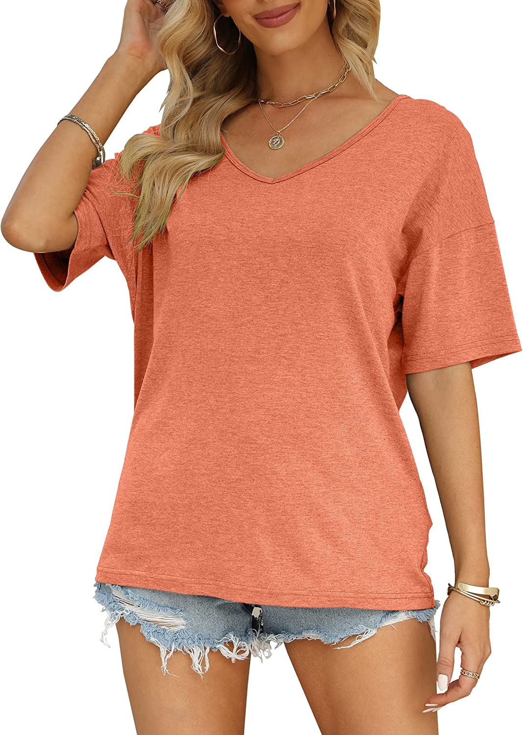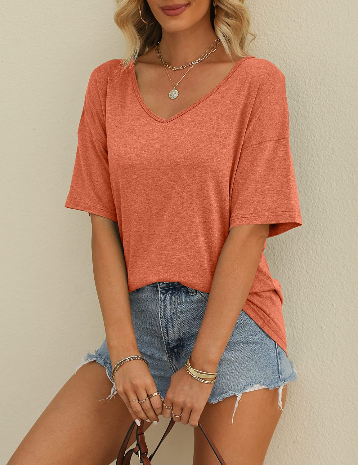 • FEATURES: Oversized style, loose fit, V-neck, half sleeves, solid color, simple and fashionable, trendy and timeless. This classic summer basic top is the perfect length and you can easily tuck the hem into your pants for a slimmer and more attractive look.