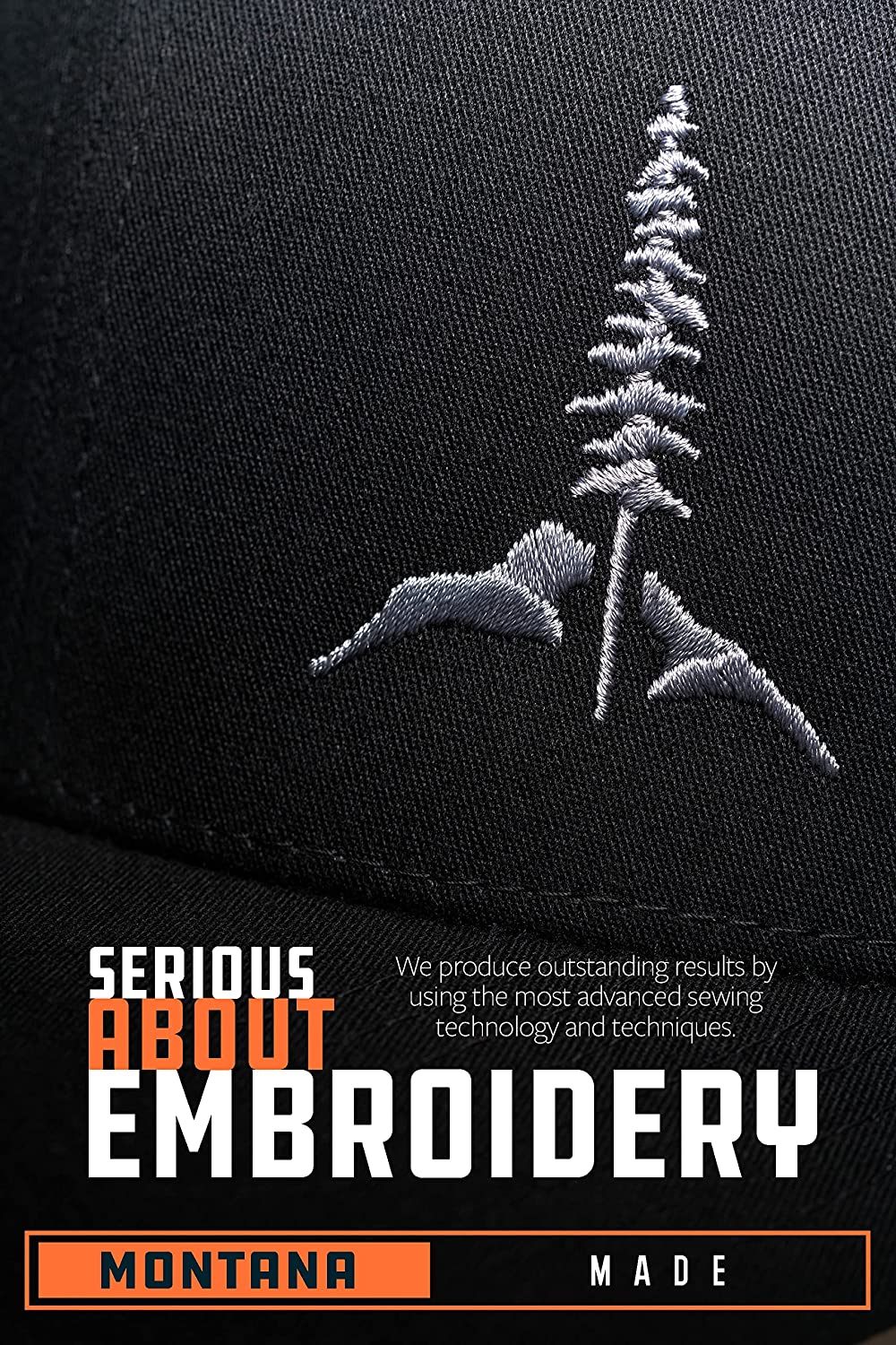 At Larix Gear we are serious about embroidery. Every Larix hat is embroidered right here at our shop in Columbia Falls Montana by us. It's our highest priority to achieve outstanding results by using the most advanced sewing technology and techniques available today. We have chosen Pacific Headwear 104c Richardson 112 and Yupoong 6606 models as our base trucker hats for the Larix designs. We believe these hats represent the best snapback mesh back adjustable retro trucker hats available anywhere. They are very similar to each other in quality fit shape and size. By using these models we can offer a better range of color options and in-stock availability. Not only are we committed to beautiful artwork clean stitching and crisp hats but we also painstakingly remove every visor sticker and more importantly the glue left behind. After removing the visor sticker as well as the glue we brush each hat and use forced air to remove any thread or contaminants that have hitched a ride during the manufacturing process. Then we wrap your Larix hat in tissue paper before placing it in our custom box to keep it clean and safe during its long journey to you. You will immediately understand the level of care and craftsmanship put into your Larix hat upon receiving and opening your box.