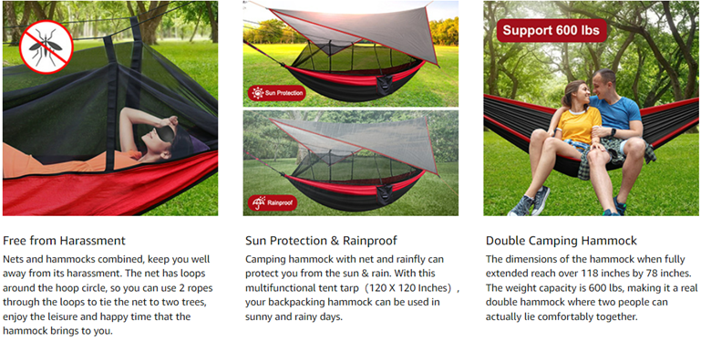 - ☀【Multifunctional Hammock Tent Tarp】: Camping hammock with net and rainfly can protect you from the sun & rain. With this multifunctional tent tarp, your backpacking hammock can be used in sunny and rainy days. As camping gear it can be folded into the storage bag, or use it separately as a tent or picnic mat.