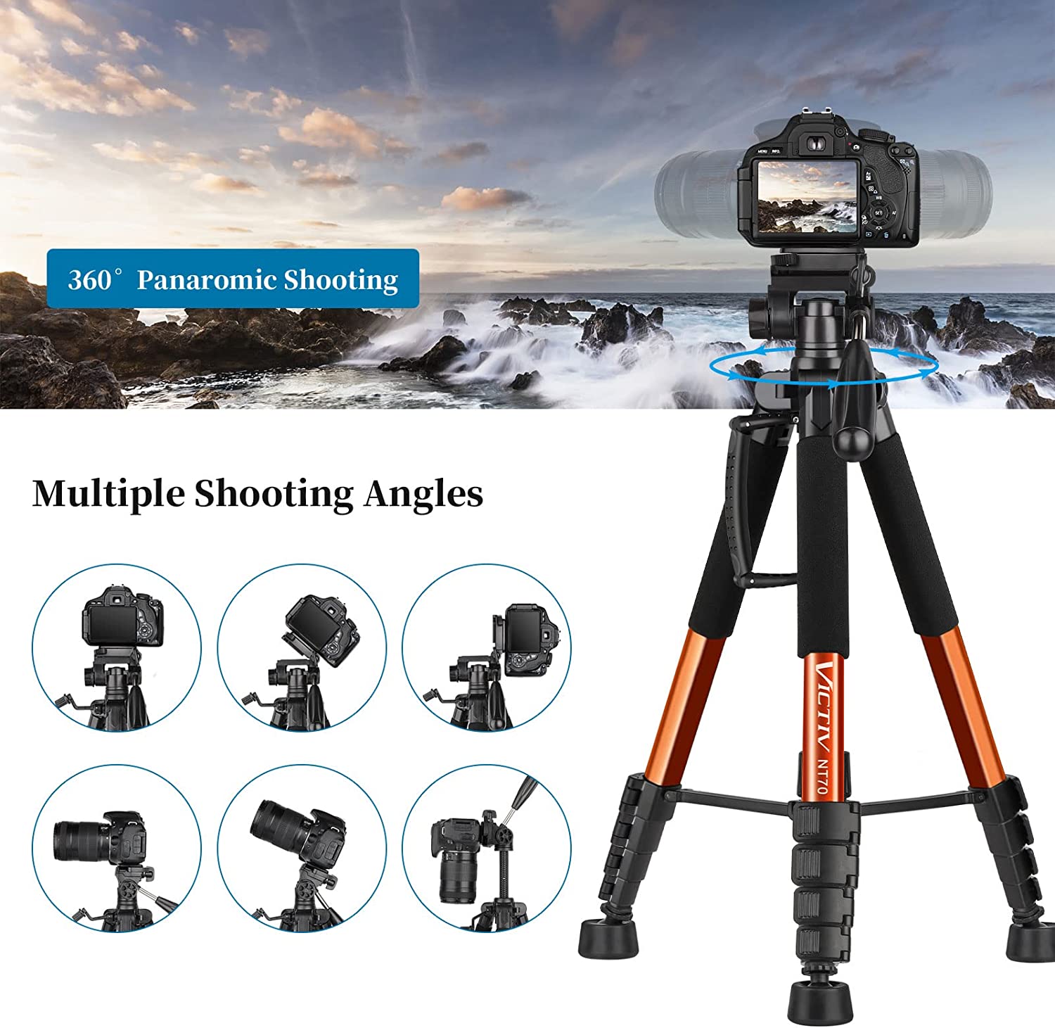 【Professional 3-Way Pan Head】VICTIV Professional camera tripod stand is equipped with a stable and smooth 3-way pan head, it allows 360° horizontal panoramic shots, 180° up and down shots, and 90° vertical portraits. Non-slip pads provide great grip. You can also hang a backpack on the weight hook for extra stability.