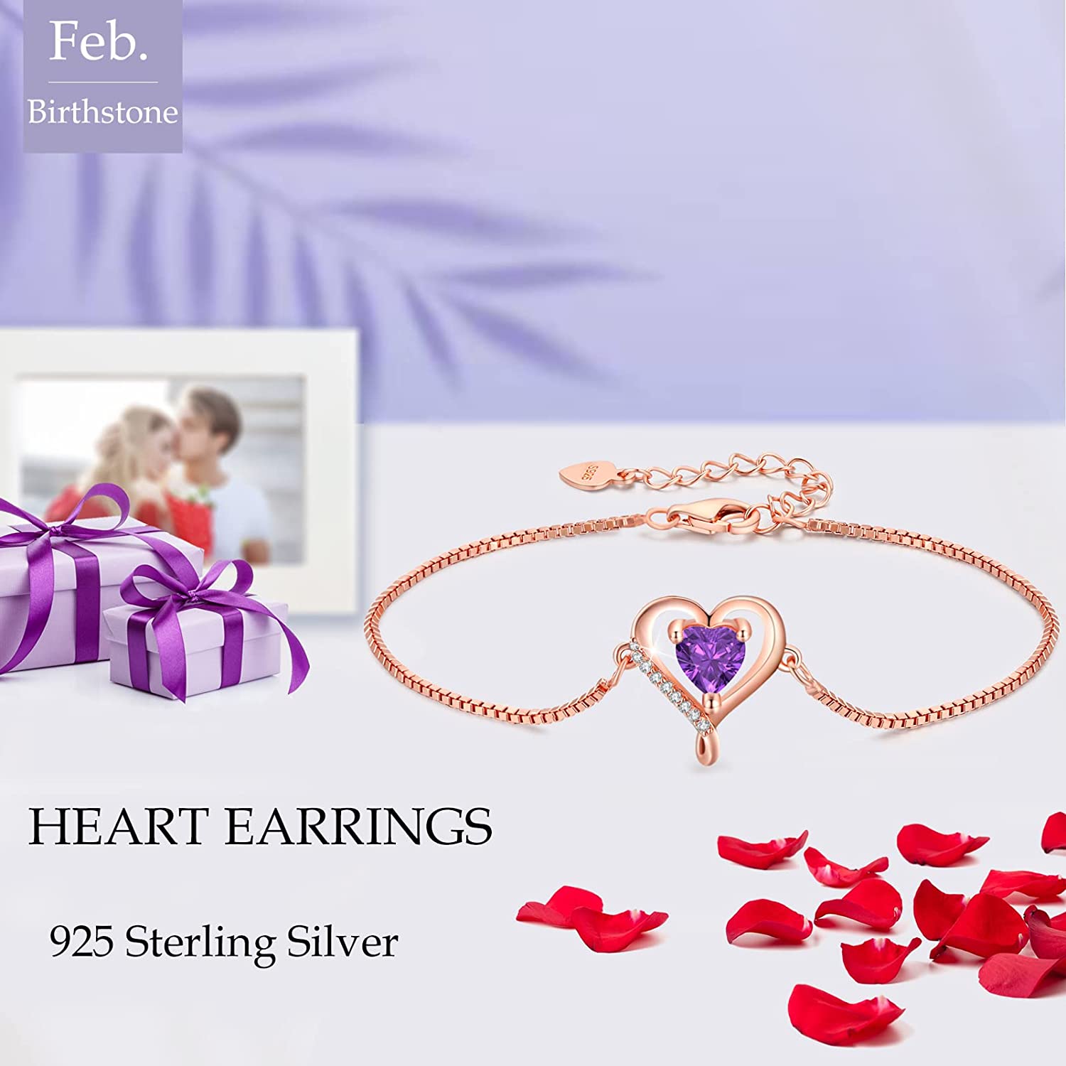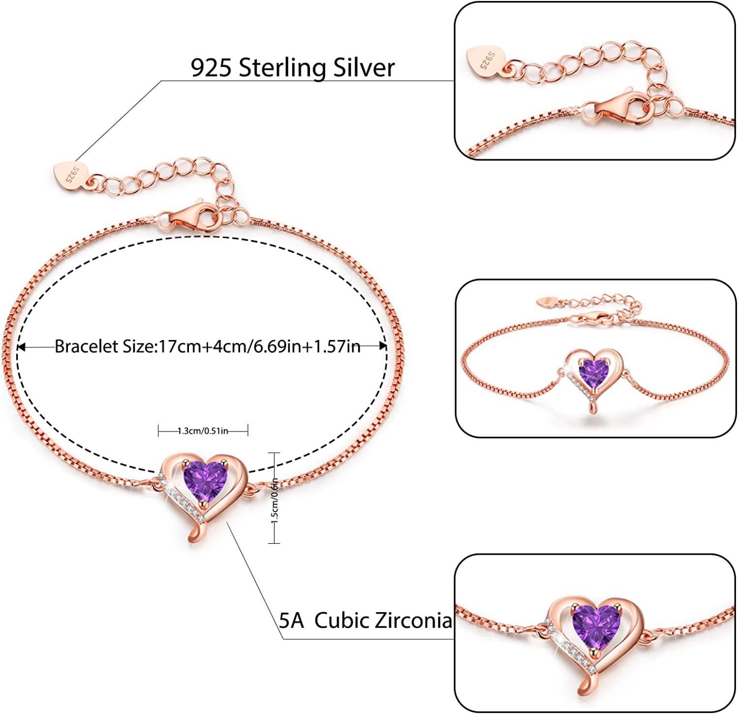 LAVUMO Heart Bracelet for Women 925 Sterling Silver Bracelet with Birthstone Zirconia,Adjustable Bracelet Best Mother's Day Gifts for Women Girls Chain Length 6.7"+1.6" Extend