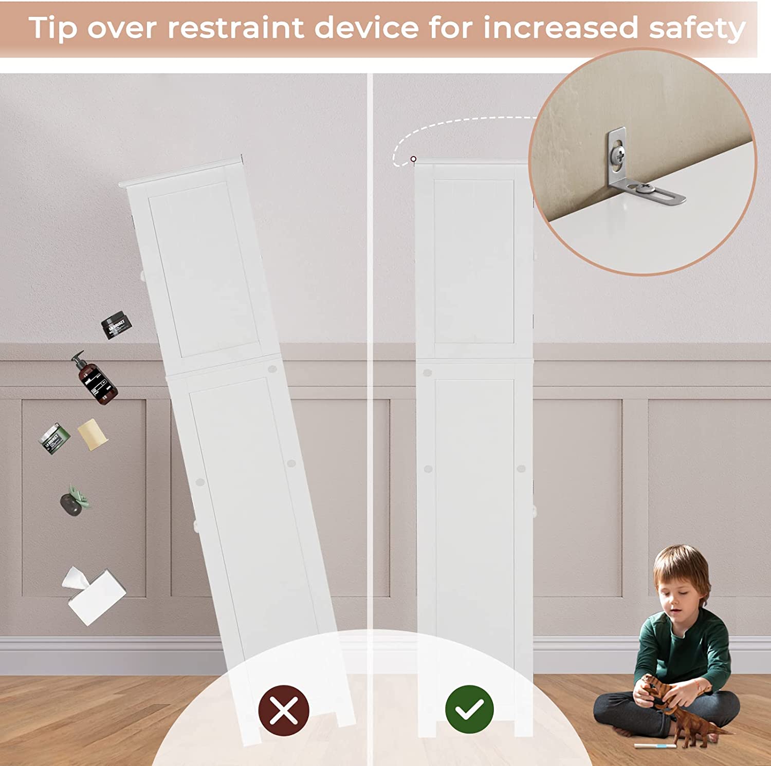 【CRAFTED & STURDY CONSTRUCTION】This tall bathroom floor cabinet is made of high-quality P2 MDF and white paint, the glass door is made of tempered safety glass. High-quality materials are waterproof and moisture-proof. This freestanding cabinet is built upon 4 raised feet, which keeps the cabinet from water immersion, and easy to clean the floor.