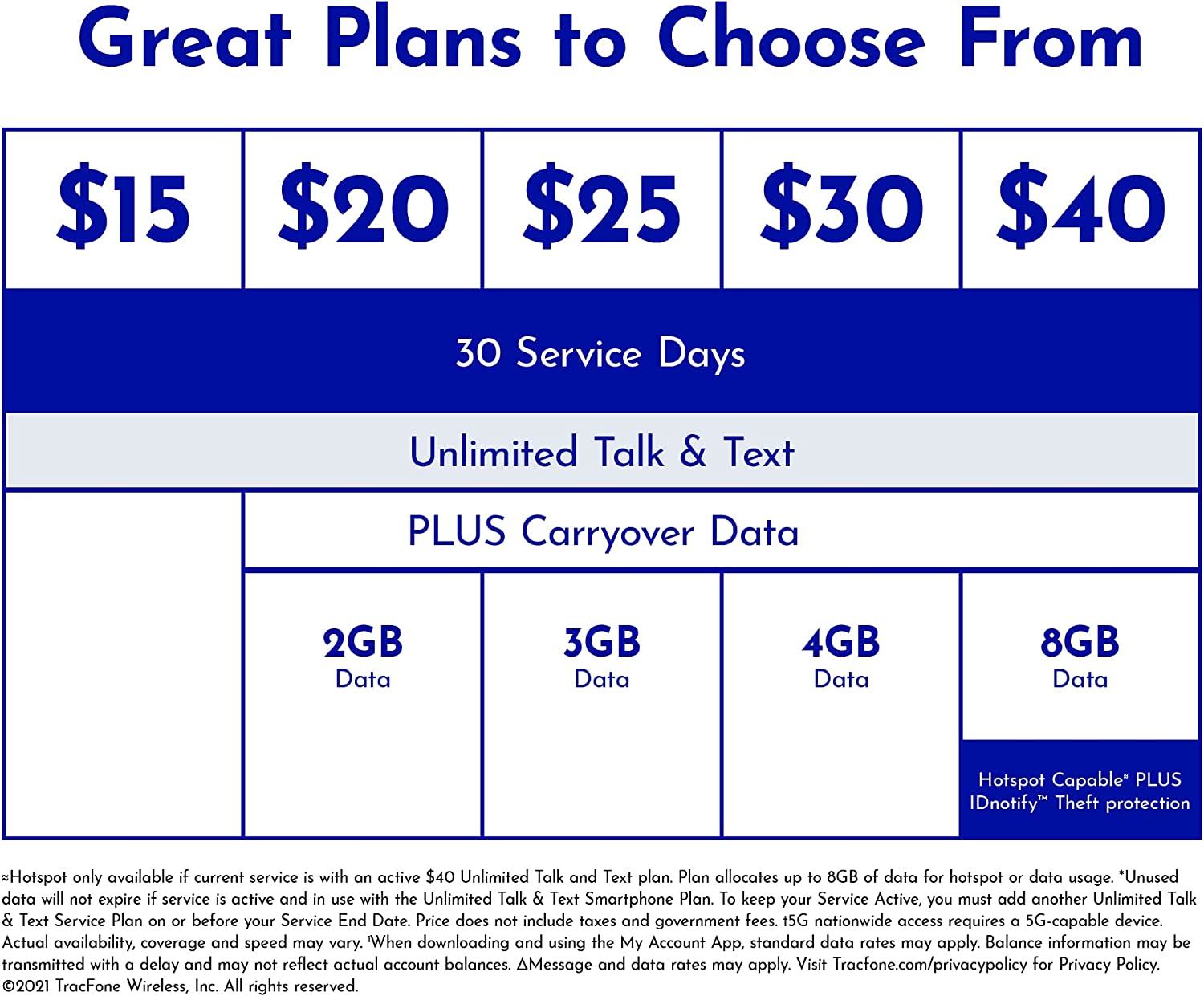 The TCL 30 Z from Tracfone delivers the simplistic smartphone experience in an affordable package, overfilling with value. Enjoy the dazzling display comfortably, in a variety of situations with enough power to last throughout the day, and the space to save all of your favorite apps, videos, and songs-all wrapped in a sleek and low-profile prime black finish. Pair it with a Tracfone plan with Unlimited Talk & Text with Unlimited Carryover® Data** and enjoy Unbeatable Nationwide coverage on the largest and most dependable networks†. Service Plans are compatible with both 4G LTE and 5G Networks. †Actual availability, coverage and speed may vary. *Unlimited Carryover®: For Unlimited Talk & Text Smartphone plans, any unused data after your service end date will carryover to the next cycle if active service is maintained and in use with any Unlimited Talk & Text Smartphone plan. For other service plans, any unused minutes, texts and data will not expire as long as any Tracfone service plan is active and in use within any six-month period.