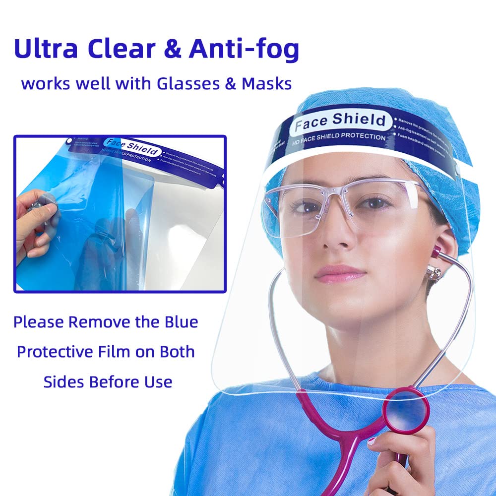 Full Clear Face Shield:Safety face shield for work is coated with anti-fog material,not fog up your glasses when you breathe.double-sided anti-fog effect. The plastic face shield mask covered with the protective films both side, befor use kindly remove them you can see clearly.