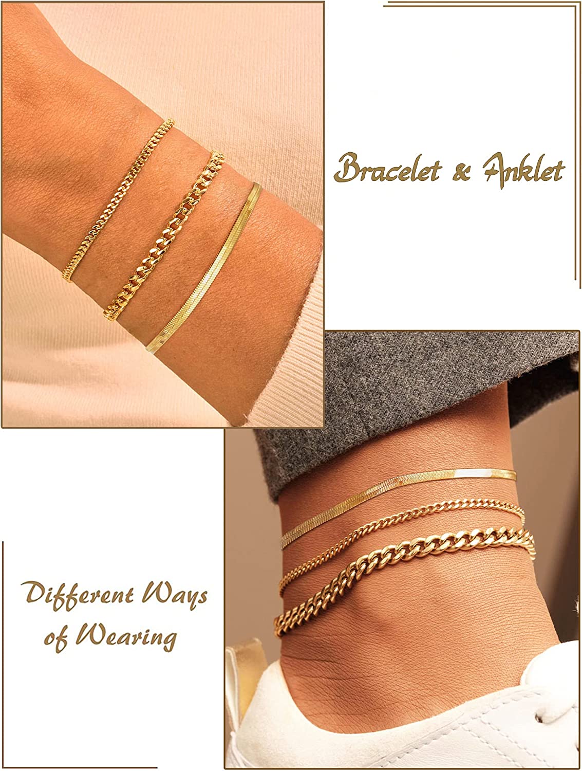 - 【3Pcs GOLD ANKLETS SET】:? Set contains: ①Thin gold cuban link anklet ② thick gold cuban link anklet ③herringbone anklet. These anklets are suitable for layering as well as being worn alone.