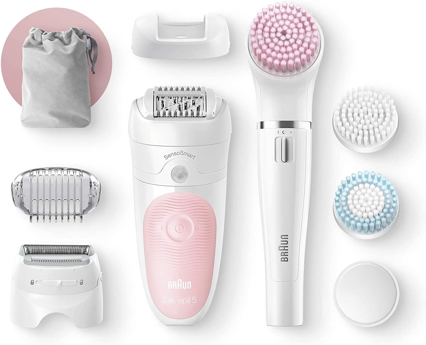 Meet the Beauty Set 5, the 6-in-1 hair removal and beauty set for face and body. Epilate, shave, trim, cleanse, exfoliate and apply creams and makeup. An exfoliating brush attachment removes dead skin cells to prevent ingrown hairs. The epilator removes 4x shorter hair than wax - for up to 4 weeks of smooth skin. The set includes a shaver and trimmer attachment for hair removal in sensitive areas. Three facial brush attachments for cleansing and exfoliating, and a makeup sponge for applying creams and makeup. Cordless use for up to 30 minutes. 100% Wet&Dry. Epilate while bathing or showering to reduce plucking sensation. With regular use, epilation is virtually painless.