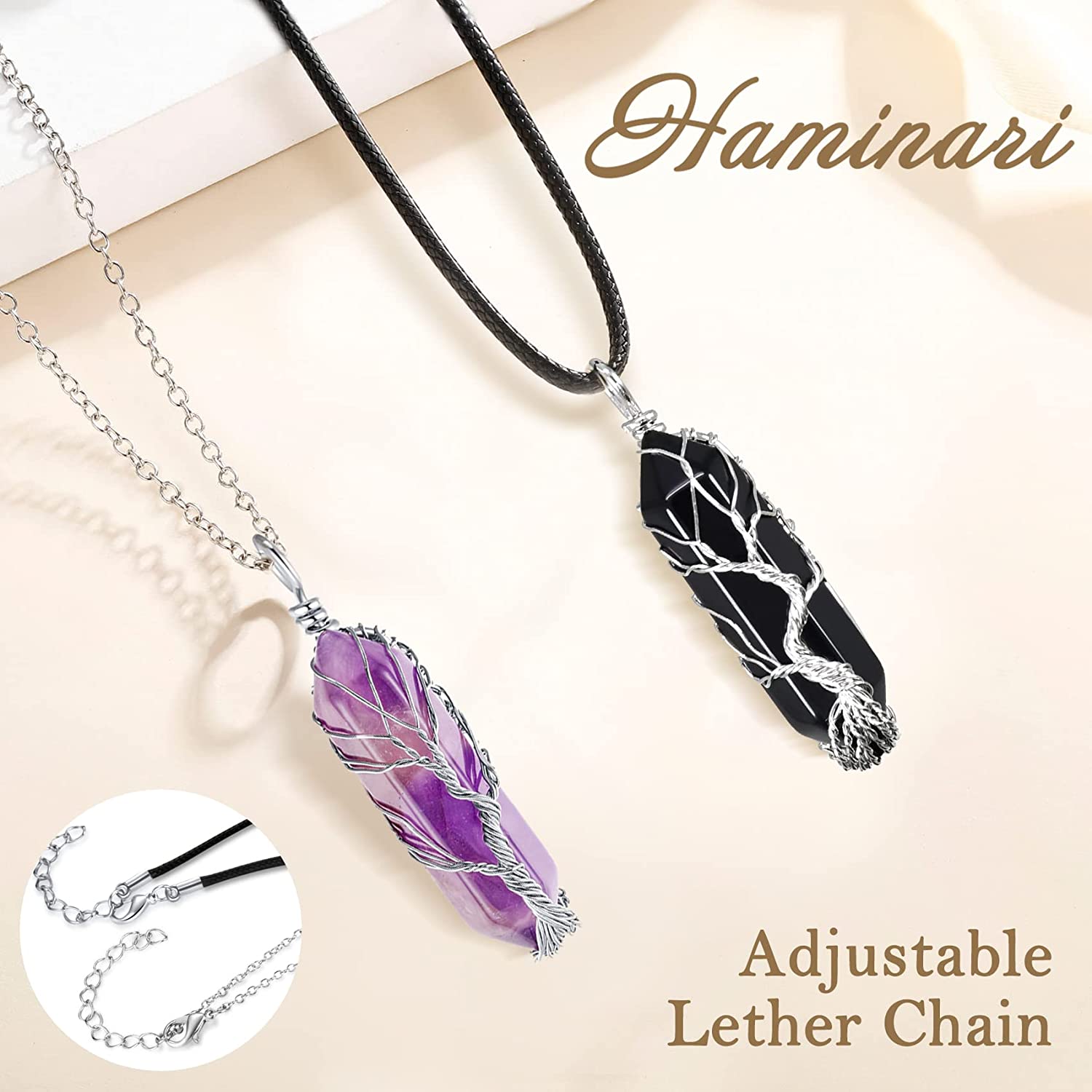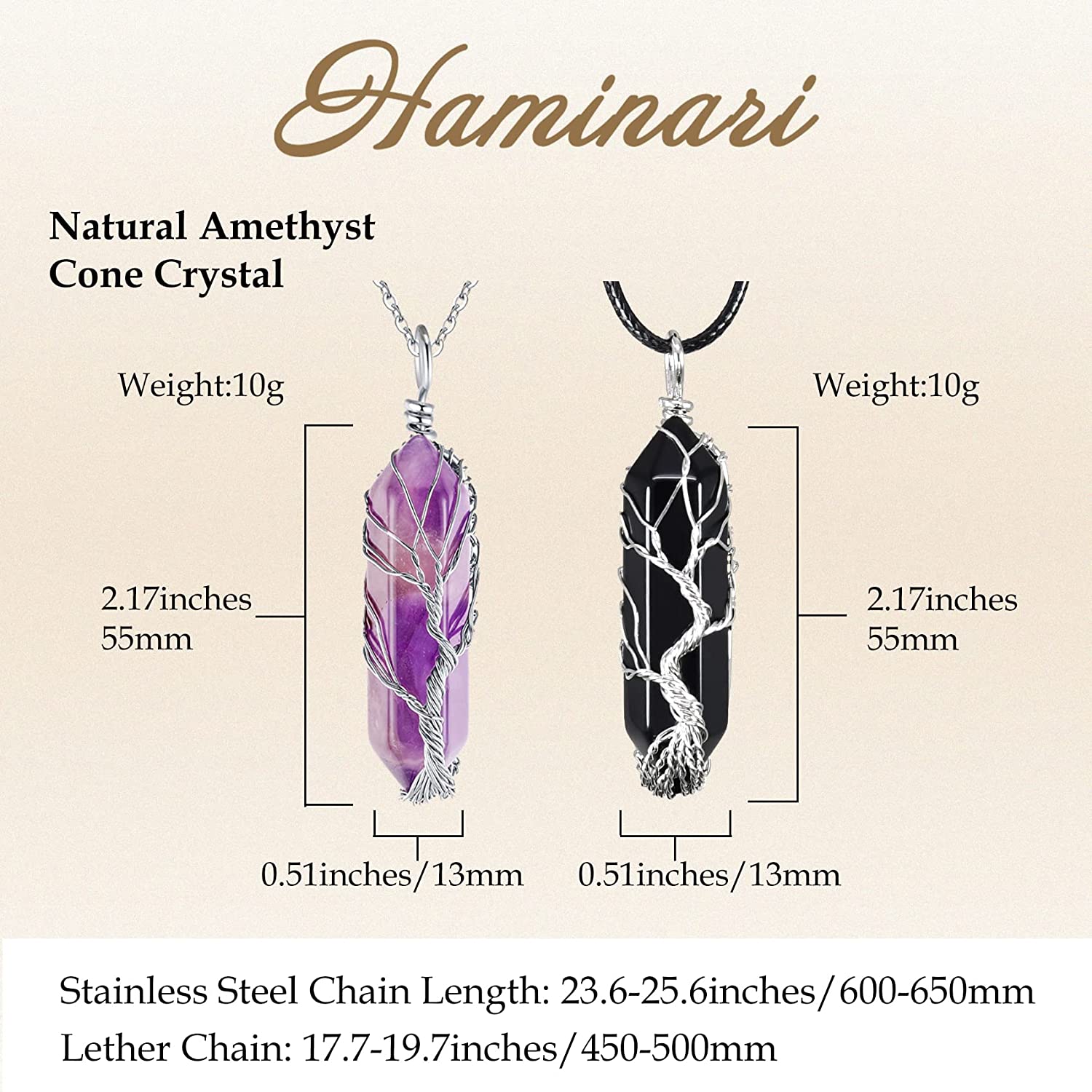 • "?DETAILED SIZES?:The Amethyst Rhombus Crystal Necklaces Length: 2.17inches/55mm;Width: 0.51inches/13mm;Weight: 10g. The Obsidian Rhombus Crystal Necklaces Length: 2.17inches/55mm;Width: 0.51inches/13mm;Weight: 10g.Stainless Steel Chain Length: 23.6-25.6inches/600-650mm;Lether Chain: 17.7-19.7inches/450-500mm,You can choose your favorite and suitable chain to match the Necklaces"