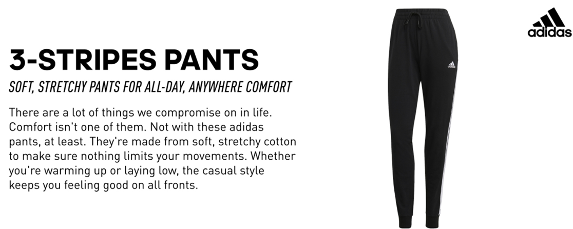 Classic style is classic for a reason. These women's pants show off iconic 3-Stripes on the leg and an adidas Badge of Sport on the hip. Cuffed hems and a slim fit keep the look clean and streamlined.