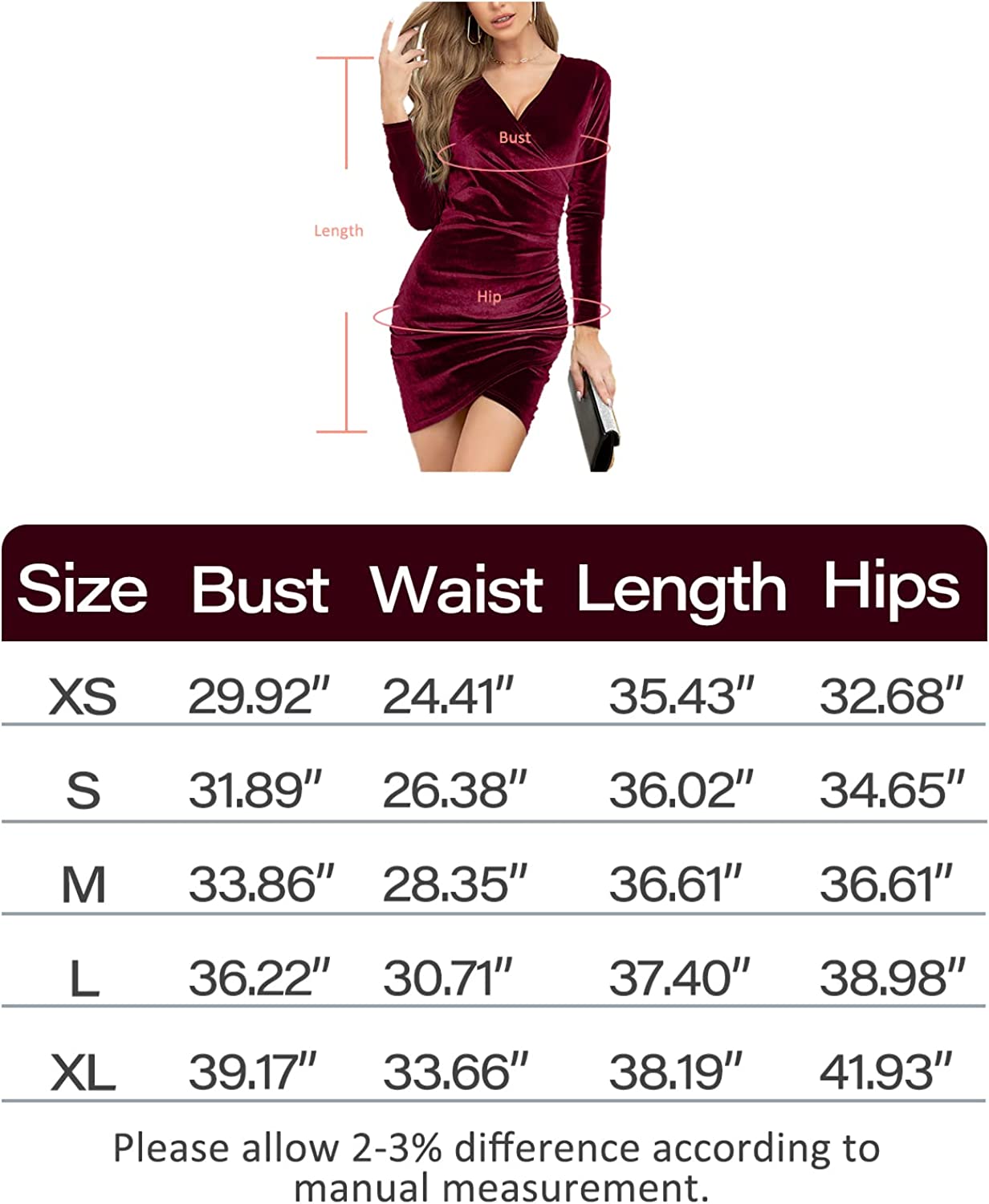 • 【Features】 Advanced stretchy velvet, wrap V neck, long sleeve, low cut, high waist, front slit with an overlapping, ruched hem, mini length, slim fit, fashionable solid colors, velvet dress has elastic pleated design which hides belly fat greatly. A tulip hem is so charming and modify the female curves.