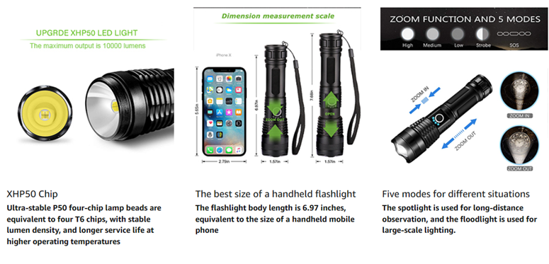 | Specific Uses | ● Long Range, ● Adjustable Light Modes, ● High Power, ● Adjustable Focus, ● Rechargeable, ● Impact Resistant |
