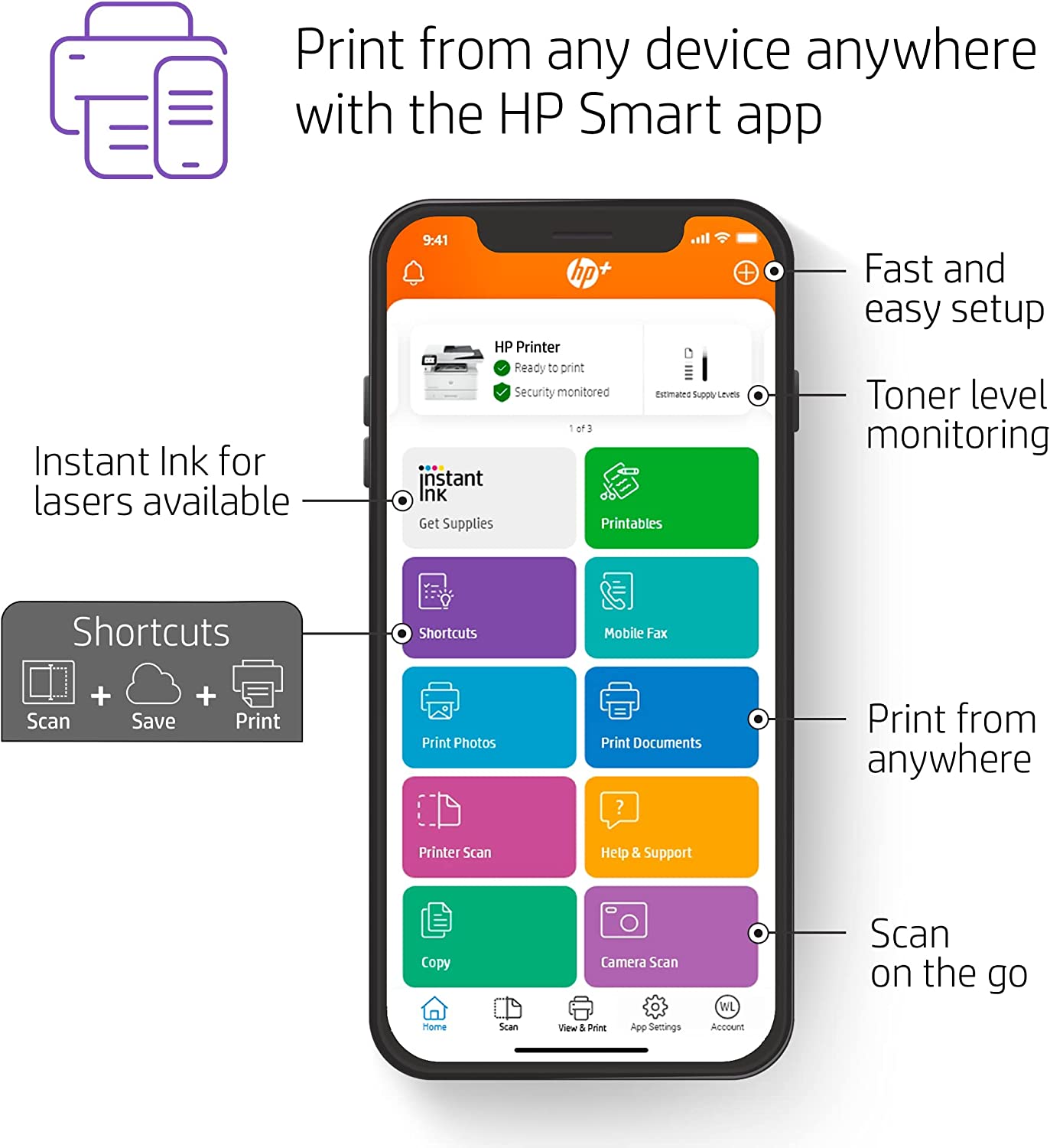 SET UP AND MANAGE FROM ANYWHERE – Perfect for teams in multiple locations. HP Smart Admin Dashboard lets you set up and manage printers from a single dashboard, invite new users, track toner levels, monitor security and control settings from any location.