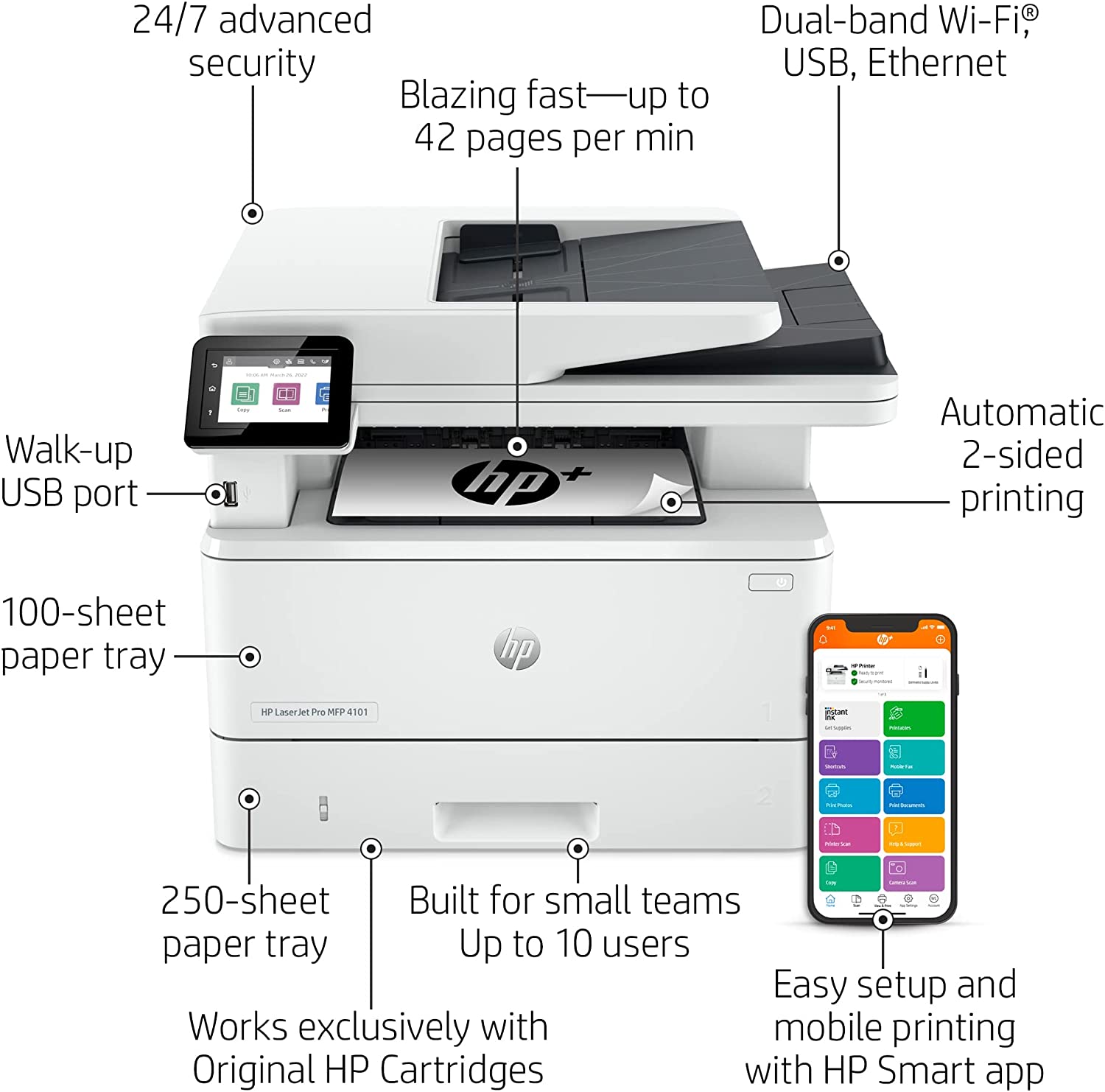 HP LaserJet Pro MFP 4101fdwe Wireless Black & White Printer - Smart Printer Requires Internet to Operate | Print, Copy, Scan, Fax | Fast Speeds | Mobile Printing