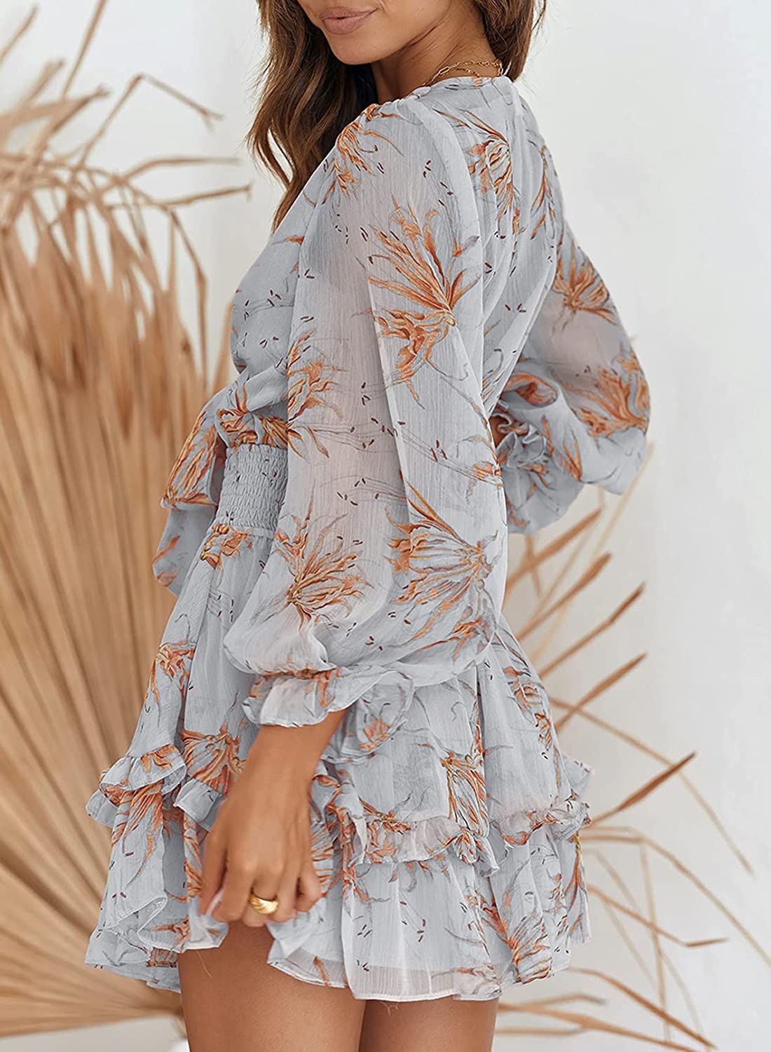 Features: Vintage Solid/ Floral Print Dress,Sexy Deep V-neck,Cut Out Tie Knot Front,Long Puff Sleeve,High Wiast,A Line Silhouette, Short Knee Length,Casual,Bohemian,Flowy Beach Dress.