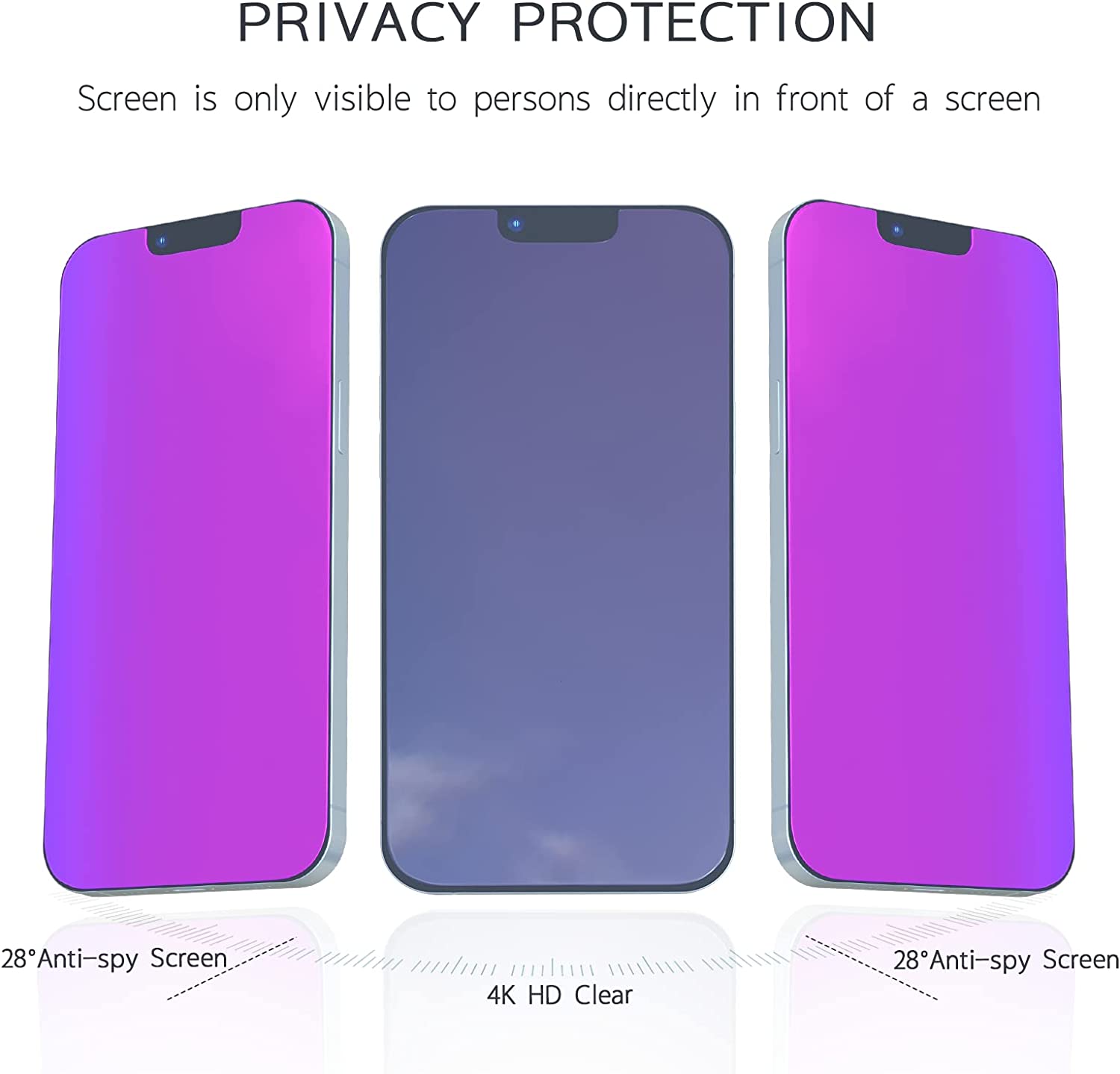- 【28° Privacy Protection】Privacy screen protector for iPhone 13 Pro Max/iPhone 14 Plus, the screen only visible to people within 28°, people beside only see different shades of purple screen. Protect your privacy and sensitive information when in public.