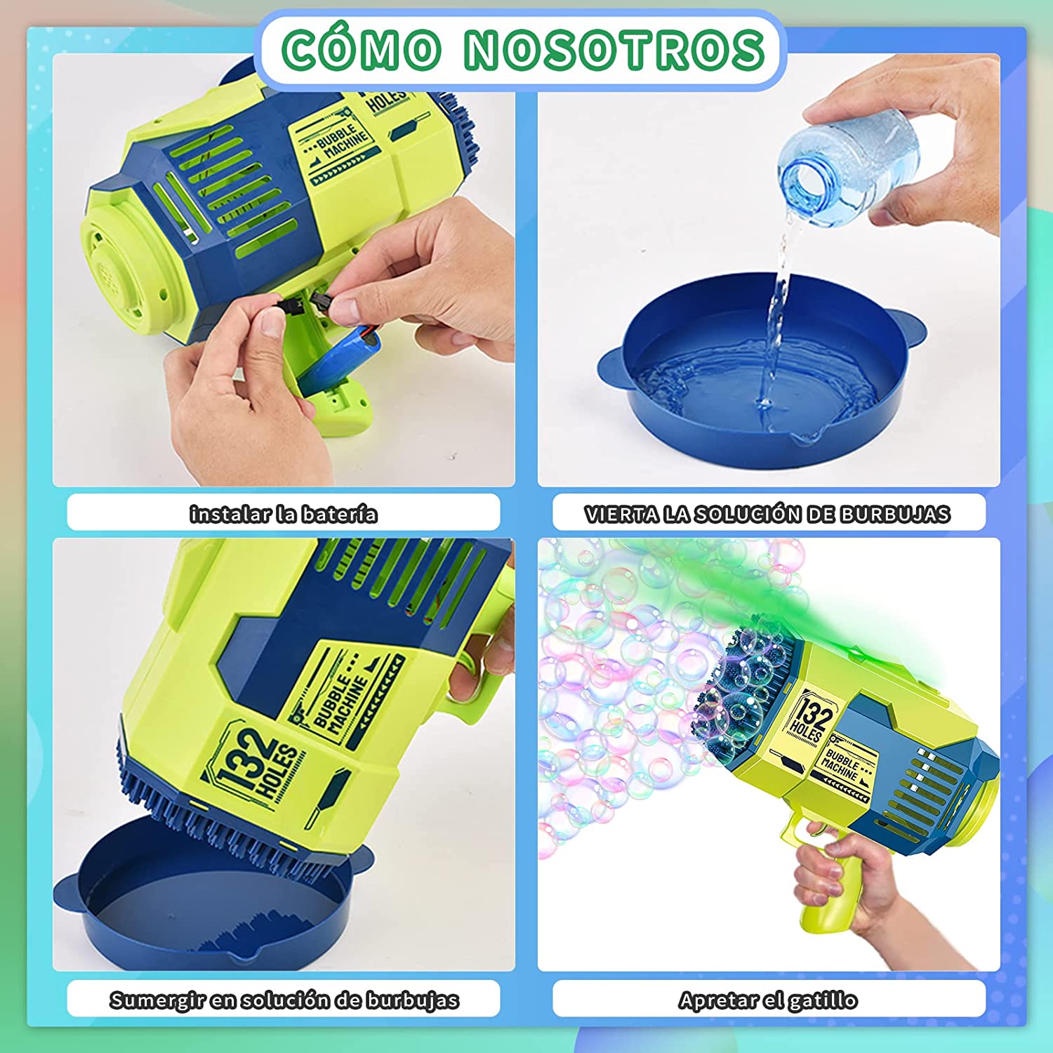 【Newly Upgraded 132-Hole Design】- The product includes a 132-hole Bubble Gun, two Bubble Liquid Bottles, 50 concentrated Bubble liquid packets, one sticker, one bubble tray, a rechargeable battery, and a charger. The tray is easy to clean and won't stick to your hands.