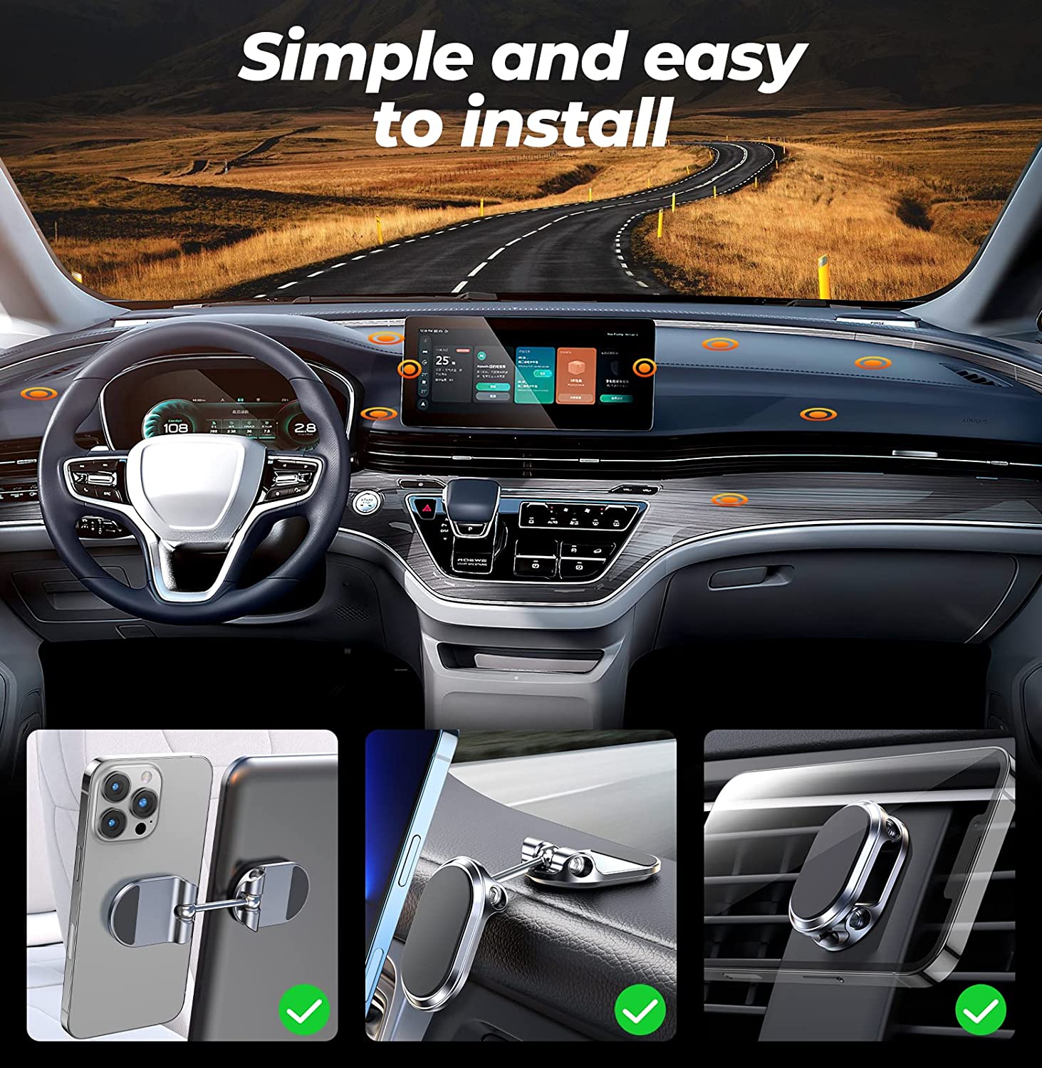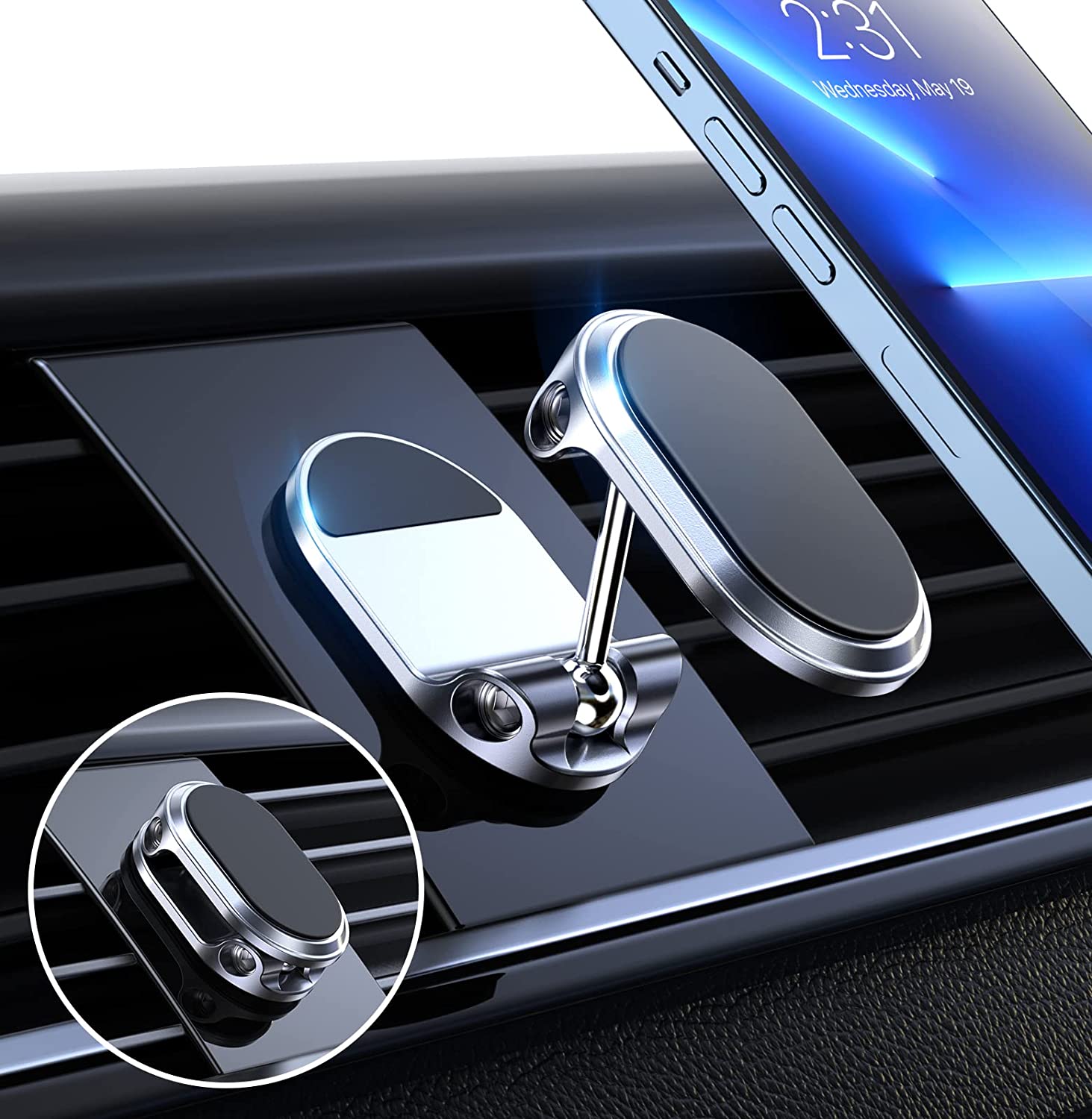 Dual 360 degree and easy to install: The magnetic car phone holder is a portable accessory. It does not block any view while driving. Equipped with double 360 degree adjustable connector ball, you can adjust the angle of the phone at will. Please find detailed installation diagrams on the product page, correct installation can avoid a lot of unnecessary trouble.