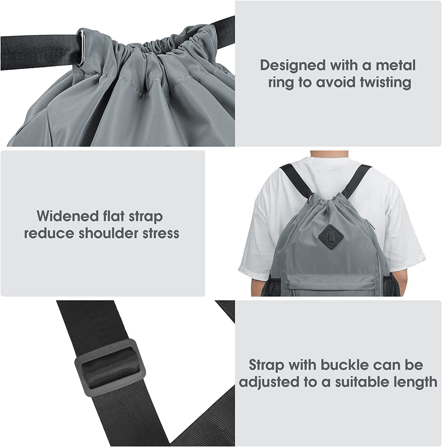 Design details: Cinch sack is made of tear-resistant and water-resistant fabric. The widened straps can relieve your shoulders stress and can easily be adjusted for a custom length. In addition, the gym drawstring backpack comes with a hanging loop for convenient storage.