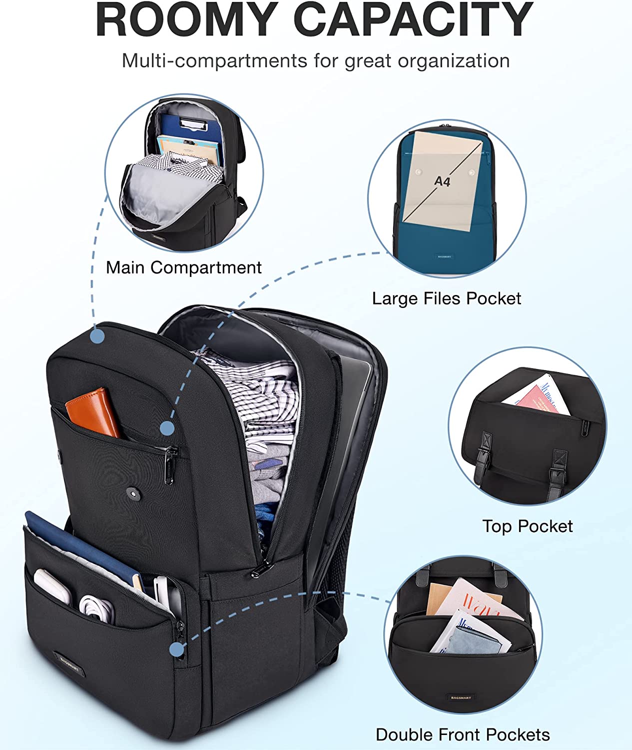 Large Capacity - The laptop backpack, 12.2"L x 7.9"W x 17.7"H, 1.76lbs, provides roomy capacity to store your clothing, A4 folders, books, 17.3'' laptop, tablet, chargers, mouse, textbooks, water bottle, umbrella, and other daily accessories. The width of the main compartment can accommodate up to a 2-inch plus a 3-inch binder. The airline-approved carry-on can be fitted overhead and under-seat, it's ideal for a weekend trip, business trip, or travel