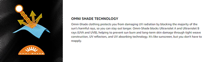 • OMNI-SHADE: For mild to extreme sun exposure. Blocks harmful UVA and UVB rays that cause sunburns and long-term skin damage. The tight weave construction offers lasting sun protection against the full spectrum of sunshine.