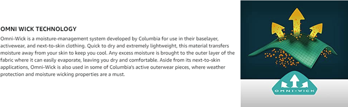 • OMNI-WICK: Moisture-wicking technology for the outdoors. Omni-Wick pulls moisture from the skin into the fabric where it spreads across the surface to accelerate evaporation—for fast drying, enhanced next-to-skin comfort.