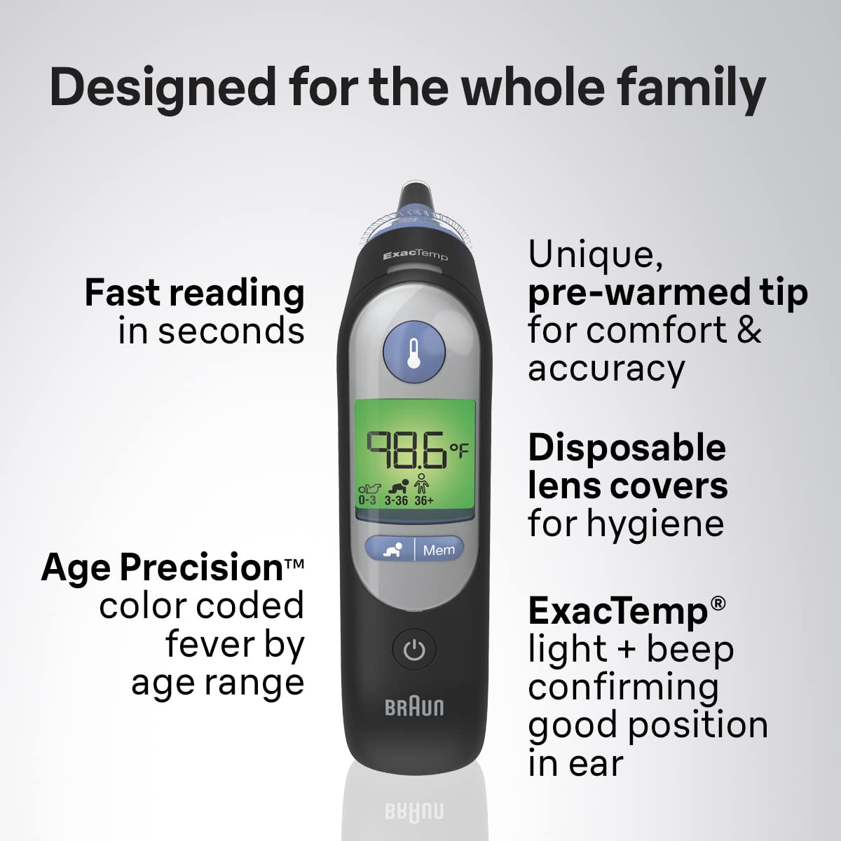 - SANITARY SHARING – It’s not just a baby thermometer for infants, this gentle Braun thermometer can be used for the whole family. The disposable ear thermometer covers/lens filters make sharing sanitary.