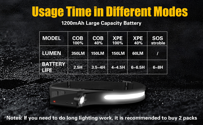 • 6 LIGHT MODES - press the power button to cycle through, COB light high, COB light low, XPE high, XPE low, Strobe Mode, Motion Sensor, long press the On/Off Button to transform the strobe mode, then the XPE and COB light will flash at the same time.