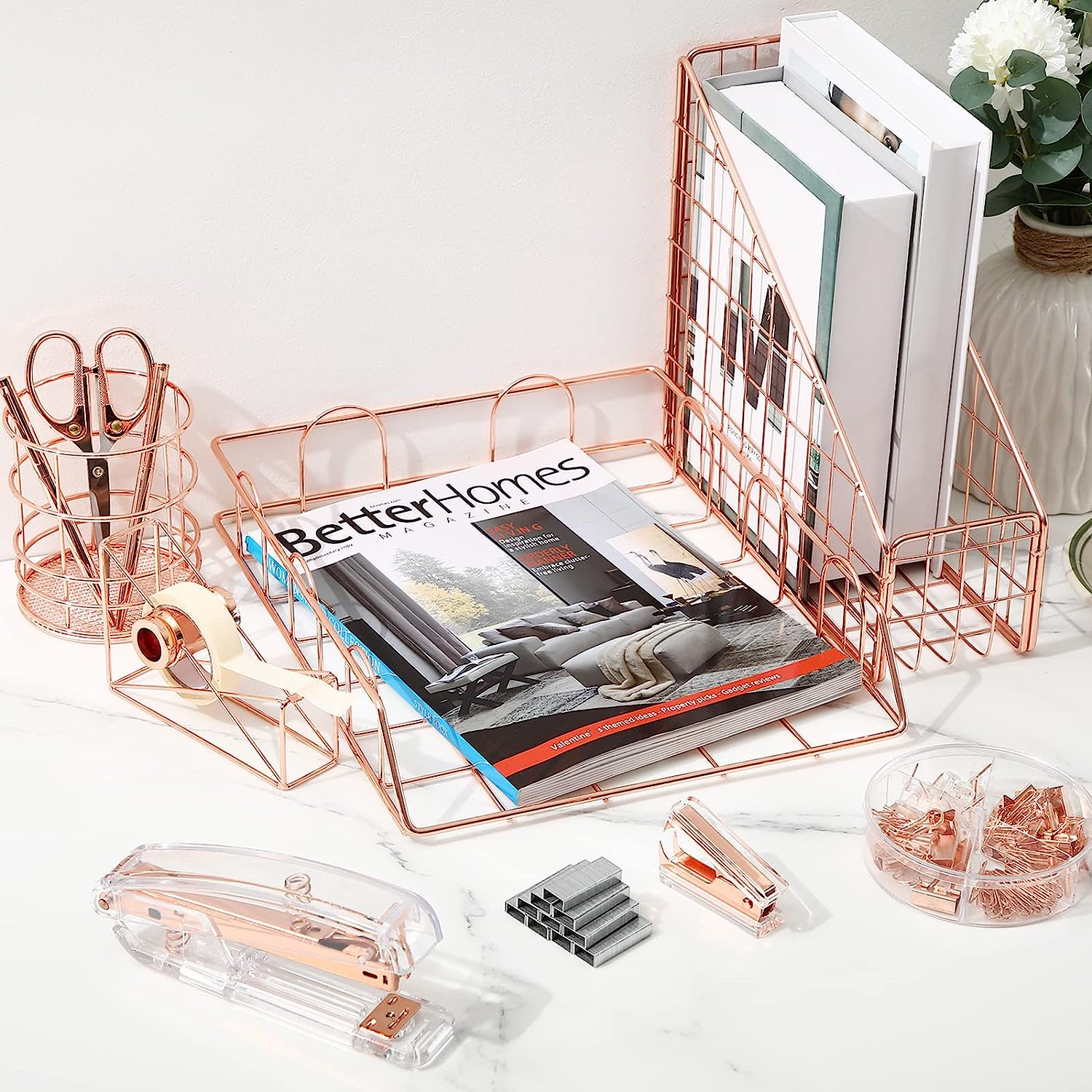 - Nice Combination: you will receive 1 piece of file holder, 1 piece of magazine file organizer, 1 piece of acrylic stapler, 1 piece of staple remover, 1000 pieces of staples, 1 piece of tape dispenser, 1 piece of pen holder, 2 pieces of pens, 1 pair of scissor, and 1 box of binder clips; The rose gold office supplies set can meet your daily and work needs, keeping your desk or desk drawer organized
