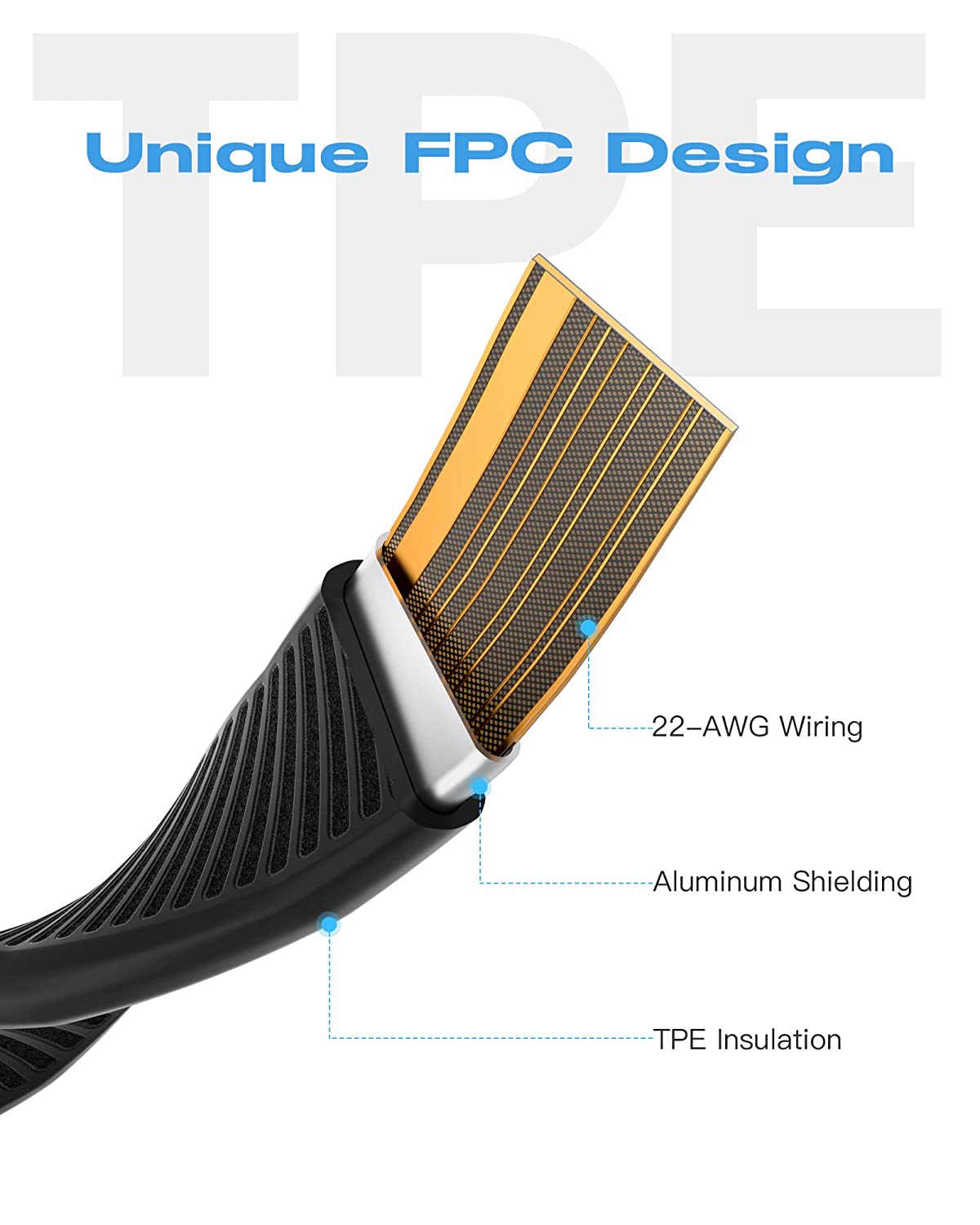 【Super Durability】:Tough exterior and superior construction that made with tough TPE 's flexcore jacket and unique FPC soft flat for a cable that durable and better looking than normal cables