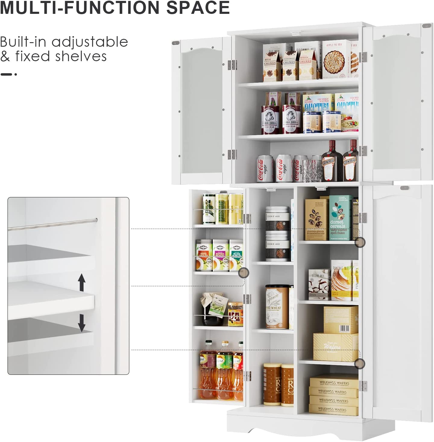 【Large Space Utilization】The pantry cabinet has 2 double door cabinets, you can see 10 sub-compartments when opened, and also 4 storage shelves behind the side door. Multi-layer shelves provide ample storage space for drinks, canned goods, dried pasta, oils, spices, and tableware. Now you can organize all your kitchen essentials neatly with this white food pantry