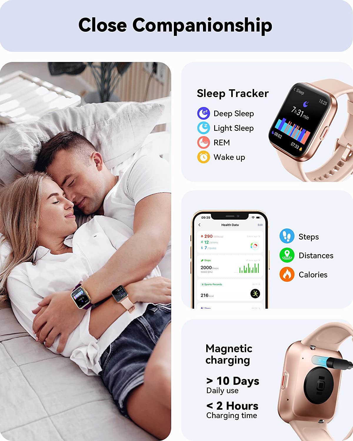 【1.7'' Full Touch HD Screen】Fitness watch features a 1.7'' full touch HD color screen, which can provide excellent picture quality and high sensitivity touch for a better user experience. Smart watch for iPhone compatible has 108+ dials to choose from, and you can also select your favorite photo as a dial in the watch. Upload your anniversary photo and gift it to your lover